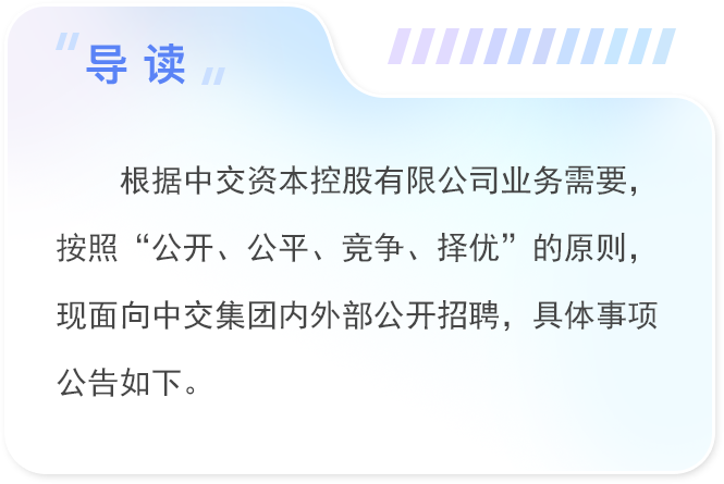 中交资本控股有限公司(以下简称“中交资本”)成立于2021年8月,注册资本100亿元,是中国交建全资子公司。中交资本坚持产业金融的发展定位,立足服务集团主业、稳步面向市场,以优化产业和资本布局、深化产融结合为导向,围绕“资金、资产和资本”三大核心要素,统筹开展各类产业金融和资本运作业务,包括融资租赁、私募基金、保理业务、股权直投、证券投资、不动产投资等,致力于打造全球卓越的产业金融综合服务商。中交保险经纪有限公司(筹)是中交资本所属湖南鑫泰保险经纪有限公司变更筹建设立,定位为中交集团保险业务统一管理服务平台。依托中交集团产业优势,坚持业务创新,打造统一平台、发挥统保优势、提升服务质效、推动数字赋能,实现风险减量,以专业高效的保险服务助力集团主业高质量发展。业务重点围绕建筑工程类、财产运营类、保证保险类以及员工福利类等保险领域,为集团及成员企业、产业链上下游客户等提供专业化、一体化、市场化的保险经纪服务。1.根据股东确定的发展战略和工作要求,负责开展战略的分解和落地执行;2.负责企业日常经营管理工作,组织制订并实施企业经营计划、全面预算,确保完成公司年度经营业绩目标和工作任务;3.负责保险经纪业务的市场开拓、业务管理和风险管控,提升业务运营质效;1.根据公司职责分工,协助公司总经理开展日常经营管理工作,组织落实分管领域业务开展和业绩目标的达成;2.负责分管团队的管理工作,指导督促分管业务团队达成经营业绩目标任务;1.坚决贯彻落实习近平新时代中国特色社会主义思想,全面贯彻执行党的理论和路线方针政策,坚决拥护“两个确立”,增强“四个意识”、坚定“四个自信”、做到“两个维护”,严守政治纪律和政治规矩,在重大问题上头脑清醒,在关键时刻经得起考验,自觉在思想上政治上行动上同以习近平同志为核心的党中央保持高度一致。 2.具有较强的学习创新意识,心态开放、思路开阔,主动学习和借鉴新的知识理念和经验方法,持续提升专业引领能力;坚定建设具有全球竞争力的科技型、管理型、质量型世界一流企业的职业追求。高度认同中交集团和中交资本的发展战略、核心价值观、企业文化。3.具有较强的工作能力,科学规划、脚踏实地,合理制订工作目标,面对实际问题客观分析,提出针对性举措并取得实效;熟悉相关法律法规,有专业思维、专业素养、专业方法,注重团结协作。4.具有正确的业绩观,完整、准确、全面贯彻新发展理念,尊重客观实际,真抓实干,敢于负责,勇于担当,善于作为,推动企业高质量发展,工作业绩突出。5.具有良好的职业操守和个人品行,严格遵守规章制度,认真贯彻落实中央八项规定及其实施细则精神,坚决反对形式主义、官僚主义、享乐主义和奢靡之风,诚实守信,严守底线,廉洁从业。1.学习背景:一般应具有大学本科及以上学历,保险、金融、经济、财务、工商管理等相关专业。应聘总经理的,要求具有10年以上大型保险或保险经纪公司相关工作经验和不少于4年的管理岗位工作经验;应聘副总经理的,要求具有8年以上大型保险或保险经纪公司相关工作经验和不少于3年的管理岗位工作经验;均须熟悉建筑工程类保险业务的法律法规和险种管理,具有多个实际出险索赔等具体项目案例的实操经验,熟悉中交集团主业相关的保险服务工作的优先。中交集团内的总经理岗位应聘人员应为M6(P6)及以上职级,副总经理应聘人员应为M5(P5)及以上职级。3.职业素养:具备优秀的组织协调能力、市场开发能力以及商务谈判能力;具备高度的敬业精神和责任心,具有良好的团队管理能力,能够带领团队独立开展工作。4.身体健康,新提任总经理的年龄不超过45周岁,副总经理不超过40周岁。执行中交资本及所在企业的薪酬福利制度和MD职级体系。请符合条件的应聘人员,将个人简历、应聘人员登记表及其他相关材料扫描件压缩后以“应聘岗位+姓名+联系方式”命名上传至“中国交建人才招聘平台”,同时以电子邮件发送邮箱:zjzbhr@ccccltd.cn。公司对报名人员进行资格审查,资格审查结果、面试时间和地点及相关要求将通过邮件、电话或者短信方式告知,请应聘者提供准确的手机号和邮箱地址,并及时查收短信和邮件,同时保持电话畅通。没有接到通知的,即没有通过资格审查不另行告知。根据资格审查情况,通知符合条件人员参加岗位面试、专业综合测试测评。对候选人选进行全面考察,背景调查、档案核查、体检等。1.请按要求下载和填报应聘人员登记表,同时请关注“中国交建人才招聘平台”并投递登记表及简历。报名时间为自公告发布之日起一周。