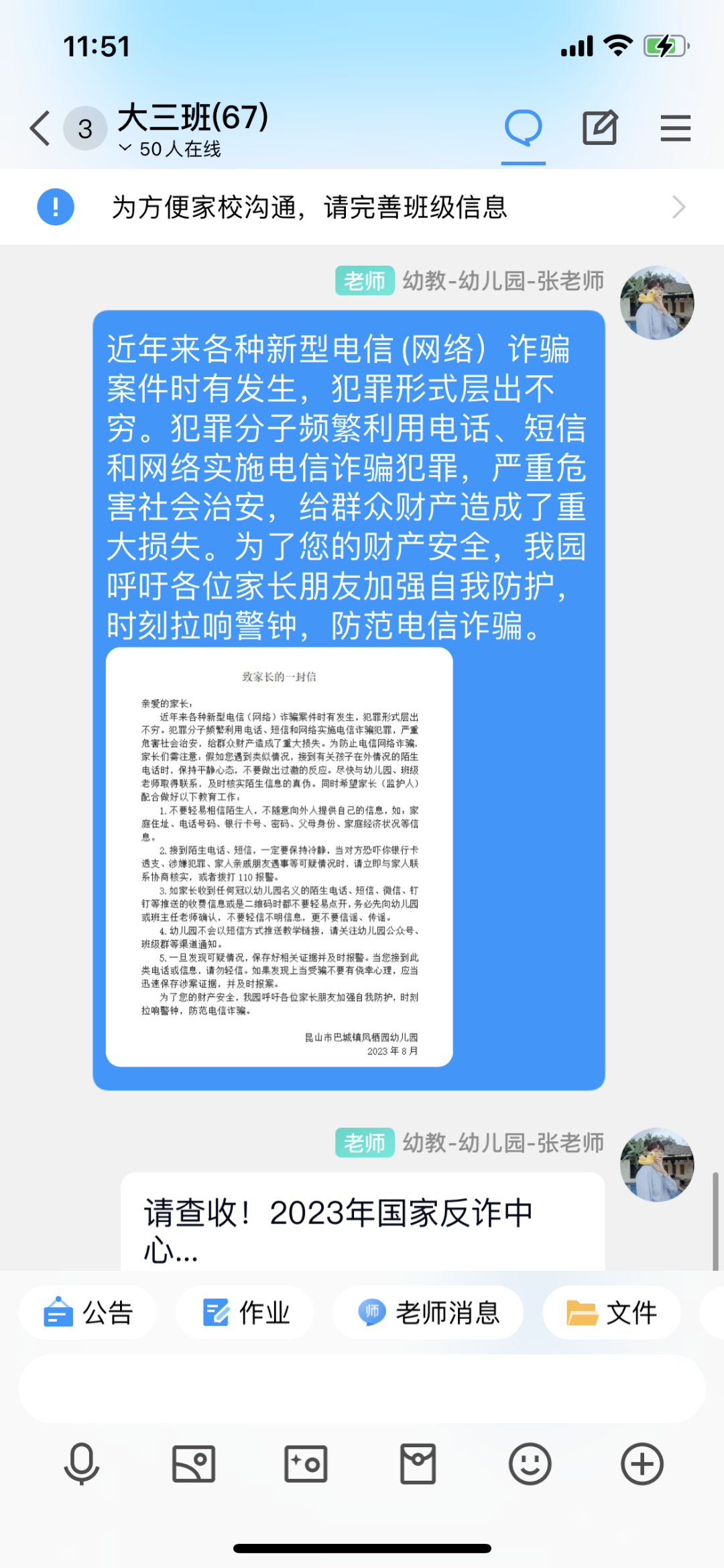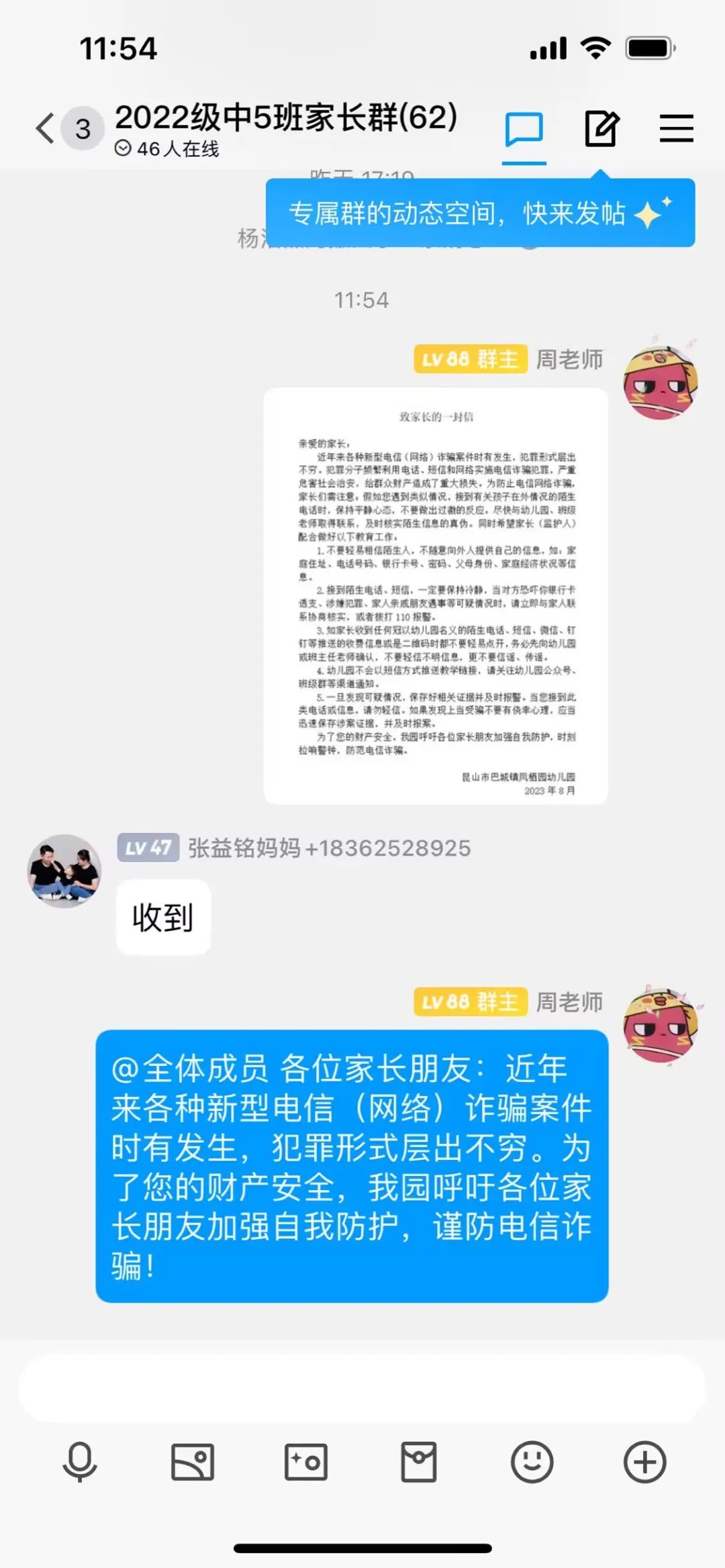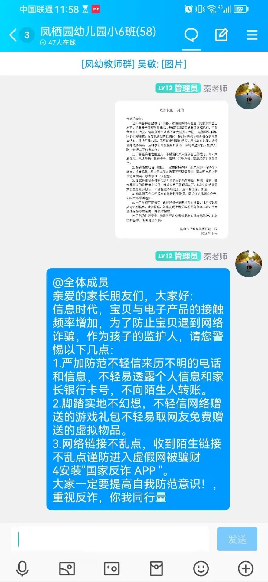 各班老师通过班级群发送《致家长的一封信》,积极向家长宣传普及防范电信网络诈骗相关的知识。