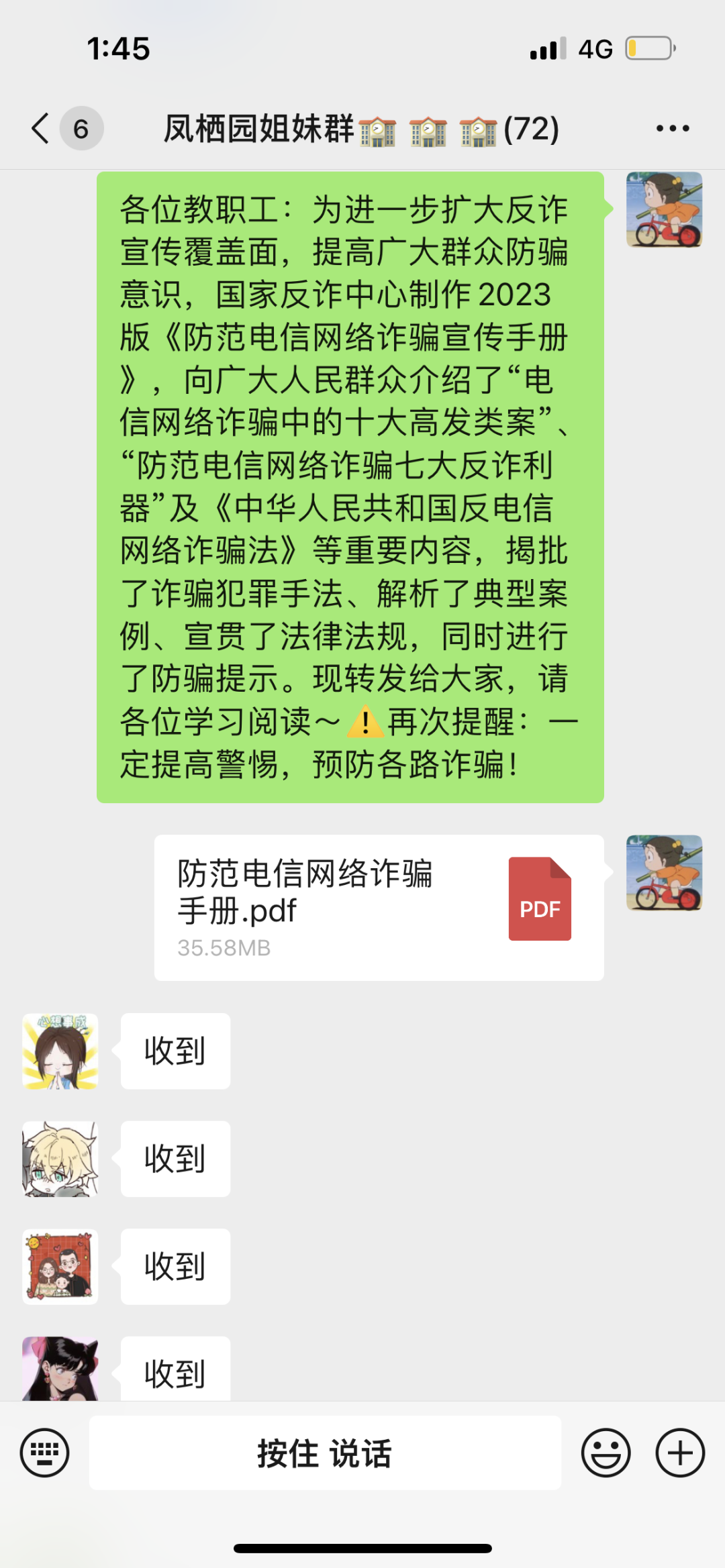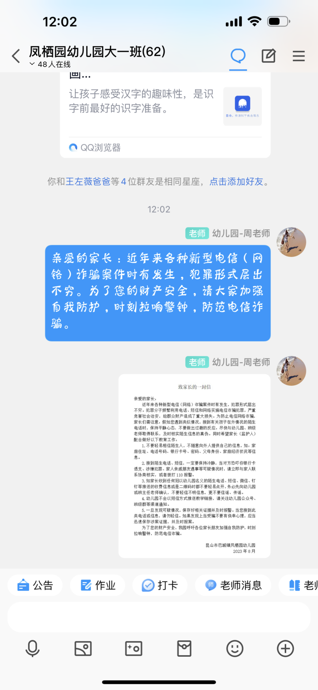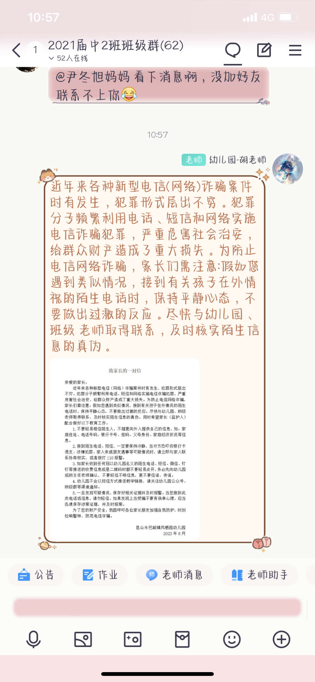 各班老师通过班级群发送《致家长的一封信》,积极向家长宣传普及防范电信网络诈骗相关的知识。