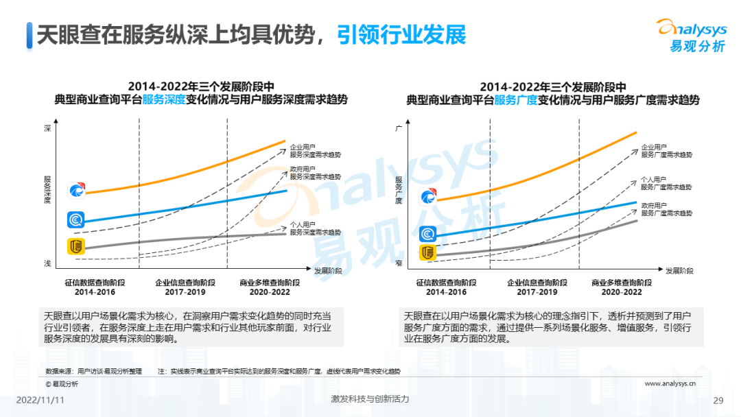 近年来,越来越多的用户开始通过线上线下多渠道了解商业查询,并在生活、生意、工作场景中频繁使用商业查询平台。商业查询的服务人群逐渐拓展,服务场景也向纵深发展。用户的需求变化是推动商业查询发展的重要因素,本文聚焦用户需求变化,分析典型商业查询平台的用户服务能力,洞察商业查询行业发展趋势,为个人、企业、政府了解和使用商业查询提供参考。