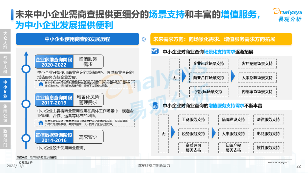 目前,商查的用户依据用户属性和对商查的使用深度和广度可以分为大众人群、专业人群、中小企业、集团公司和政府部门五类。其中大众人群和中小企业主要将商查应用在生活、生意场景,其需求逐渐拓展细化,未来需要商查平台提供更多的场景化服务、增值服务;专业人群、集团公司、政府部门更多将商查应用在工作、管理、监管场景,其需求不断深化,未来在深度分析、数智化方面的需求将越发强烈。