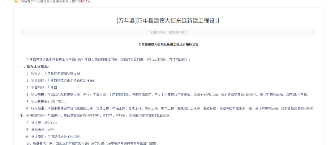 万年县建德大街东延新建工程设计招标公告