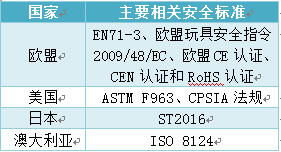 出口玩具必须符合进口国的认证标准,主要涉及玩具的物理机械性能、燃烧性能、化学性能和电气性能等几个方面,常见国家的玩具标准如下: