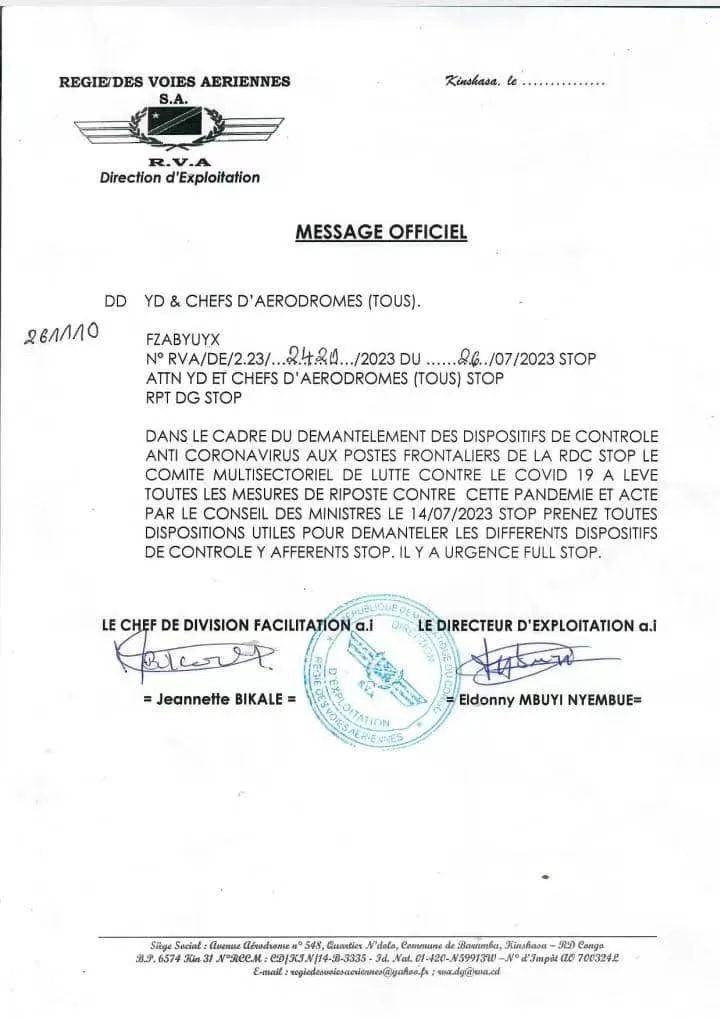 7月28日,刚果(金)航空管理局(RVA)发函指示境内所有边境站解除针对新冠相关的所有措施。根据刚果(金)政府7月14日部长级理事会批准的决定,刚果(金)机场将取消新冠检测以及出入境所需的疫苗接种卡。