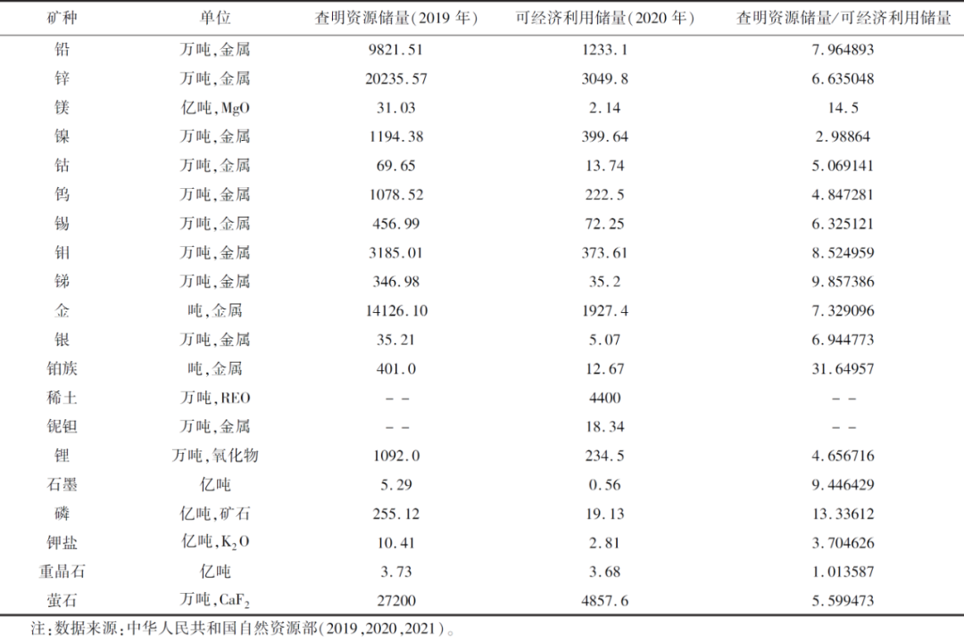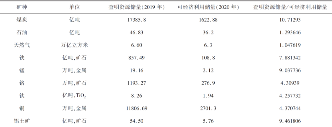 2020年,我国对矿产资源储量分类进行了重大改革,按照“有没有”、“有多少”、“可采多少”的逻辑,简化为资源量和储量两类。改革前,资源储量为当前技术条件下查明的资源储量,开发利用时需要进一步勘查及经济评价;改革后,储量为经济可采储量,直接为国民经济建设提供安全保障,对中国矿产资源公报(中华人民共和国自然资源部,2019,2020,2021)进行分析整理发现,大宗矿种查明资源储量大部分为经济可采储量的2-14倍,极个别基本相当,个别高达30多倍,表明我国战略矿产资源安全保障具有较好潜力。