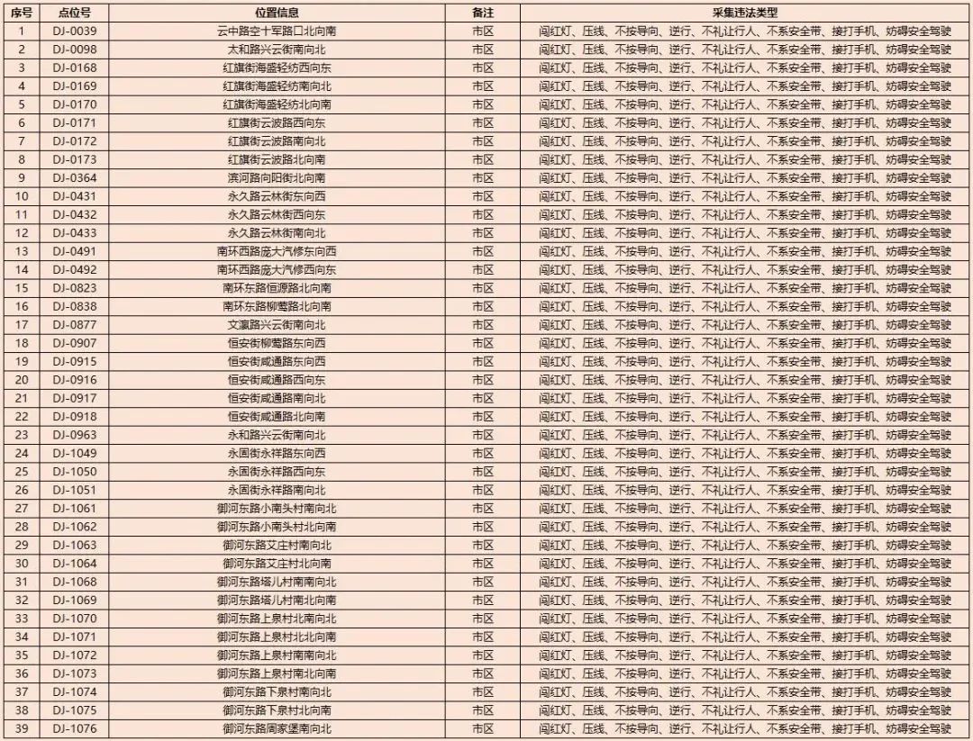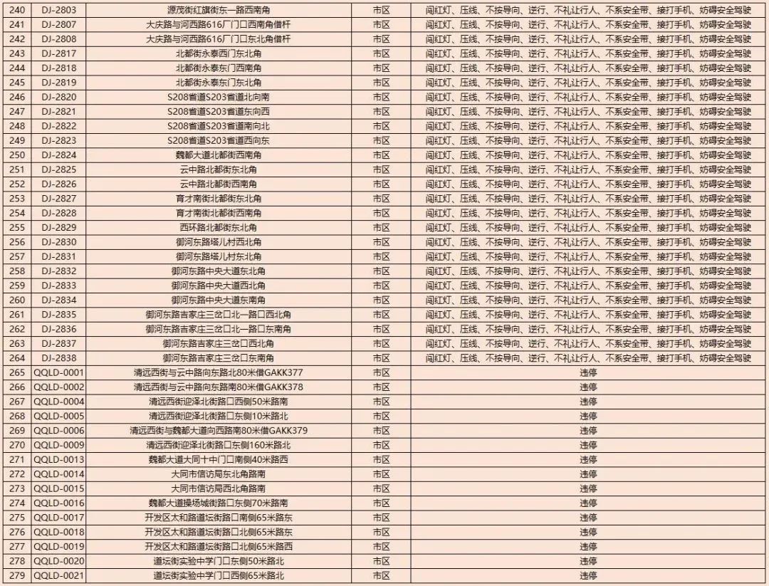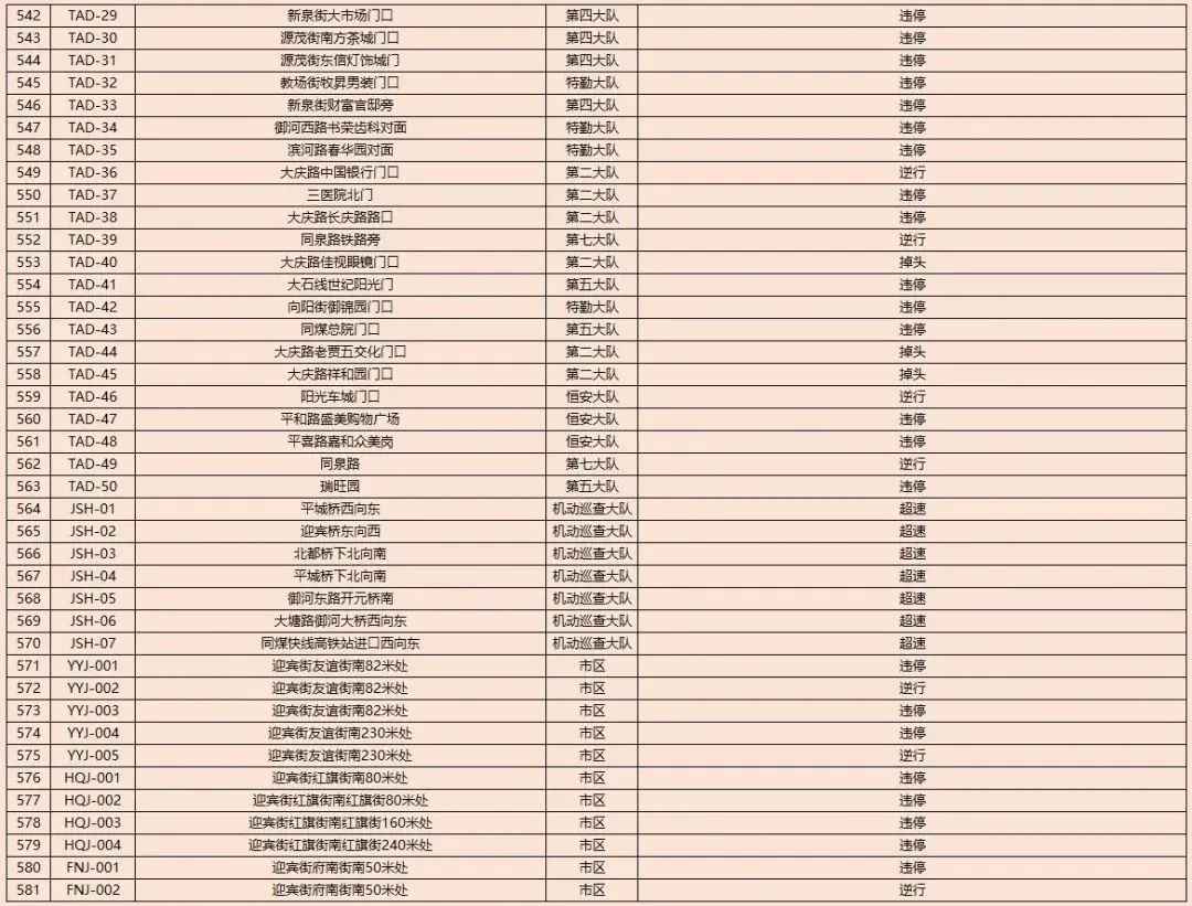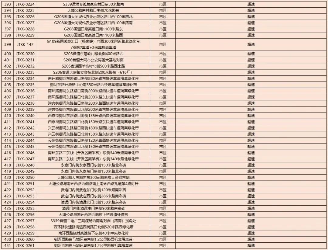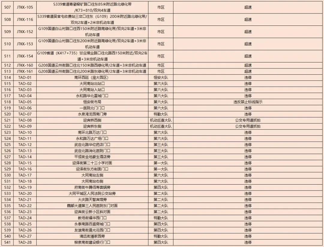 为了进一步规范我市道路交通秩序,有效遏制道路交通事故的发生,减少道路交通违法行为,净化道路交通环境,根据《中华人民共和国道路交通安全法》及其实施条例以及公安部《道路交通安全违法行为处理程序规定》要求,大同市公安局交通警察支队决定启用以下10处交通违法电子抓拍设备。将对机动车违反道路交通信号灯通行的、机动车违反禁止标线指示的、不按导向车道行驶、逆向行驶等交通违法行为进行自动抓拍取证并依法实施行政处罚。本通告自2023年8月14日开始,通告时间为30天,通告结束后所有违法数据将依法予以行政处罚,敬请广大交通参与者自觉遵守。2023年1月30日