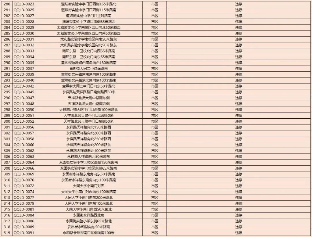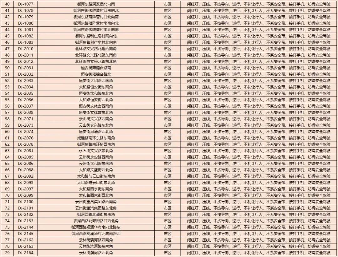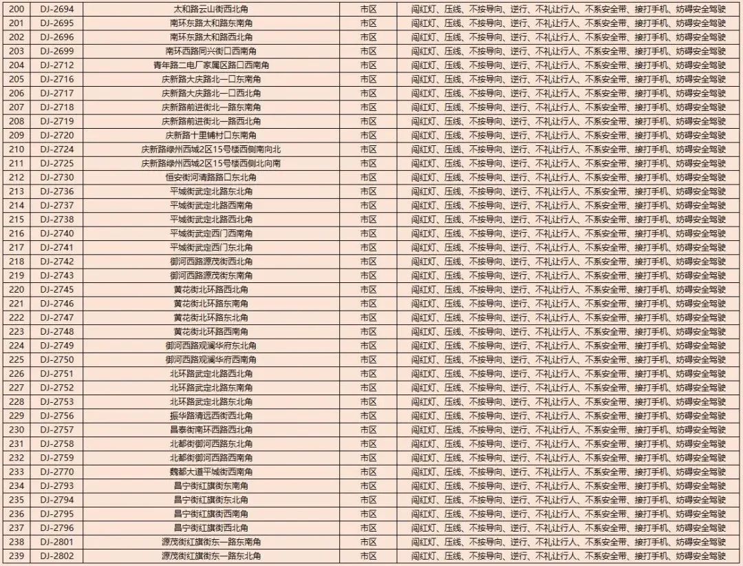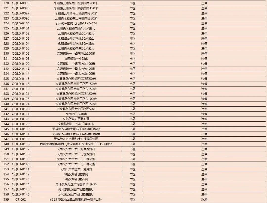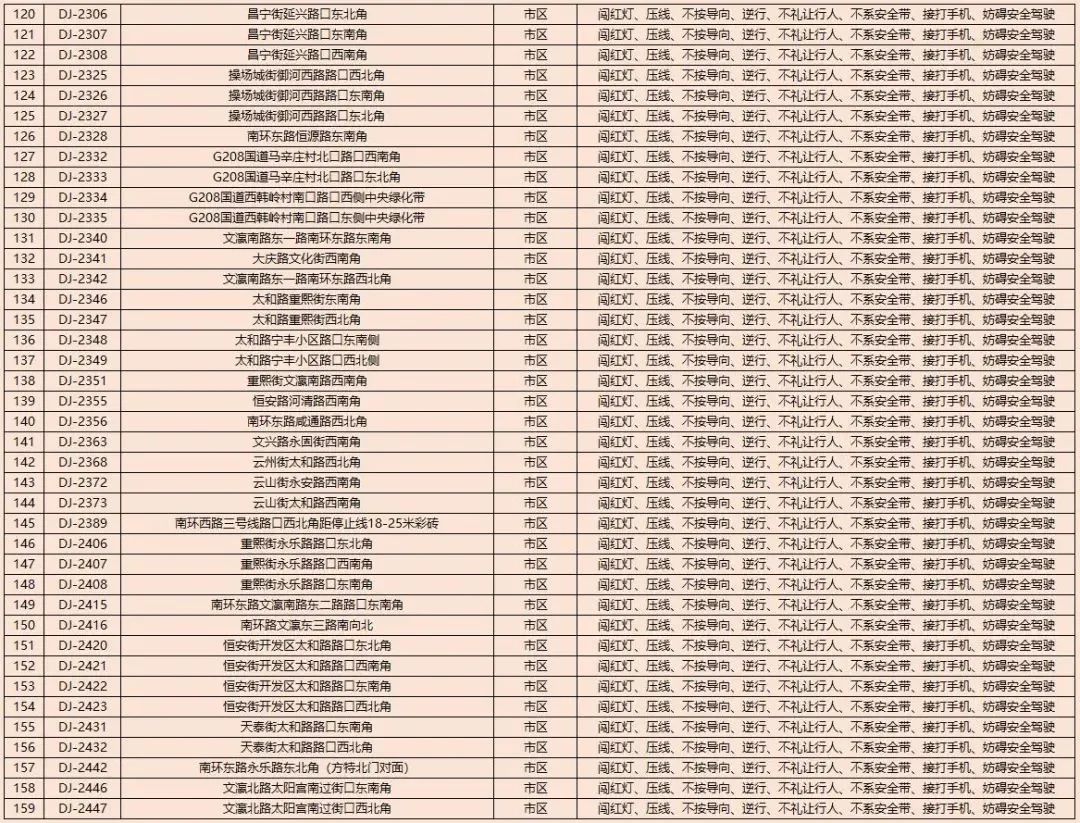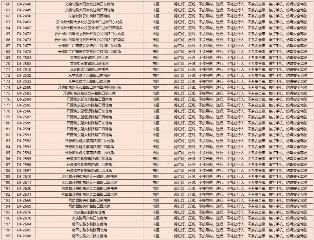 为了进一步规范我市道路交通秩序,有效遏制道路交通事故的发生,减少道路交通违法行为,净化道路交通环境,根据《中华人民共和国道路交通安全法》及其实施条例以及公安部《道路交通安全违法行为处理程序规定》要求,大同市公安局交通警察支队决定启用以下10处交通违法电子抓拍设备。将对机动车违反道路交通信号灯通行的、机动车违反禁止标线指示的、不按导向车道行驶、逆向行驶等交通违法行为进行自动抓拍取证并依法实施行政处罚。本通告自2023年8月14日开始,通告时间为30天,通告结束后所有违法数据将依法予以行政处罚,敬请广大交通参与者自觉遵守。2023年1月30日