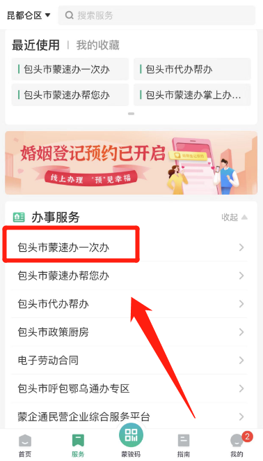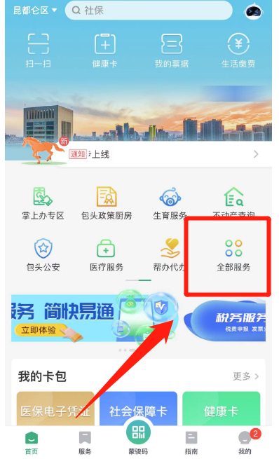 2.左上角选择地区为包头市-昆都仑区,点击全部服务-包头市蒙速办一次办-进行实名认证