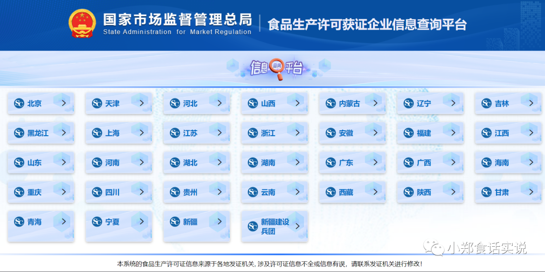 目前,国家市场监管总局已将全国所有省市自治区(含新疆建设兵团)食品生产许可证及产品明细表查询渠道进行了汇总,并将其发布在食品生产监管司查询页面,现小编将其广而告之,供广大执法人员及食品生产经营者使用参考。欢迎转发分享及收藏。
