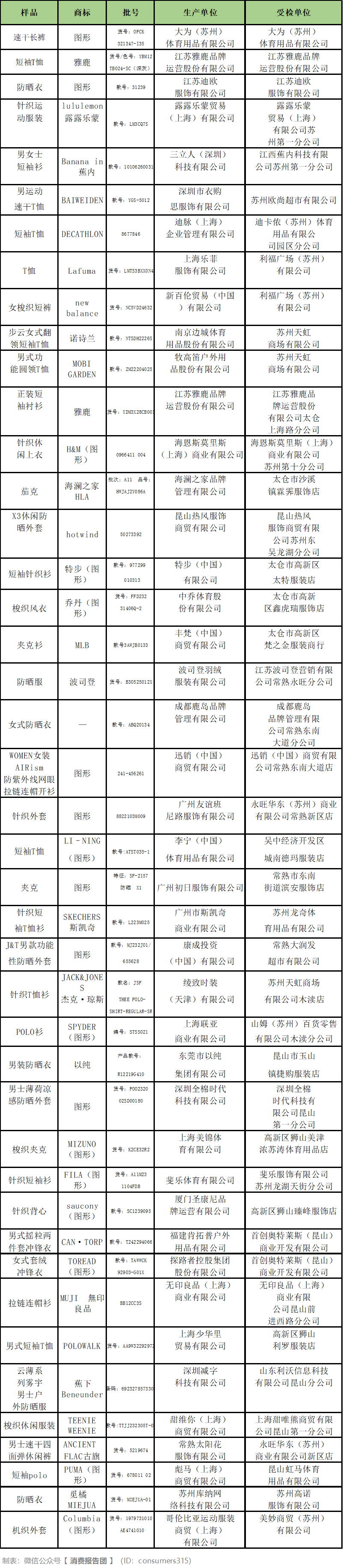 日前,苏州市场监督管理局组织对功能性服装开展质量监督抽查。本期共抽查45批产品,包括波司登、lululemon、海澜之家、Columbia、無印良品、蕉下等品牌产品,主要检验项目有: