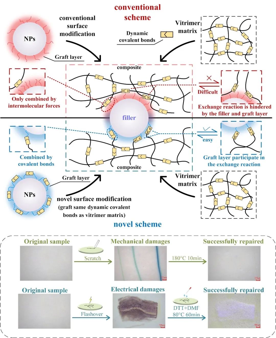 由于动态二硫键在诸多动态共价键中具有反应条件温和、无需催化剂、多重响应性、易于获得等优点,以此为启发,团队设计并制备了一种含动态二硫键的环氧树脂基高介电复合材料,通过在环氧基体和钛酸钡填料表面共同引入动态二硫键结构,实现材料介电参数的改善和动态共价键修复能力的提升;引入硫醇洗脱手段去除表面闪络后的杂质,实现绝缘材料电损伤的有效修复。