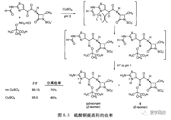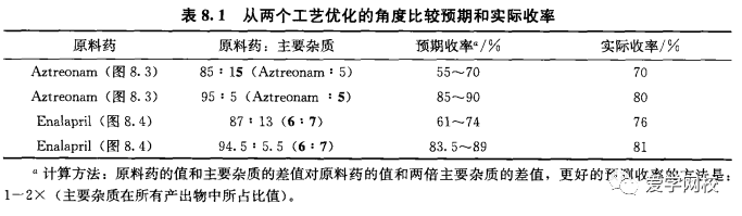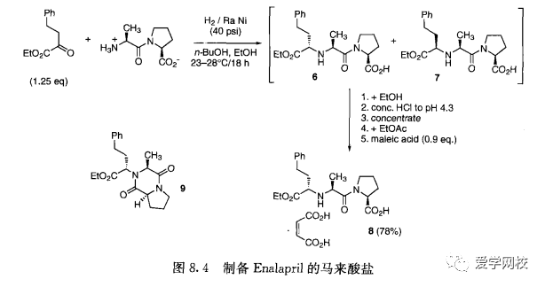 从表8.1可以看出,在重结晶过程中每1%的杂质会损失1%~2%的产品,E构型的5是合成aztreonam (图8.3)的主要杂质[2],在制备肟的反应中加人CuSO、可使E/Z异构体的比例从85: 15提高到95:5,收率也从70%提高到80%。这一步的优化可使aztreonam的收率比最初的工艺提高14%。在制备enalapril maleate 8时,非对映异构体7 (图8.4)是主要杂质。优化反应条件可把6: 7的比例从87 : 13提高到94.5 :5.5,收率从76%提高到81%。这些条件的优化有望把enalaprilmaleate的收率提高6.6%。通过工艺改进降低了每公斤原料药的成本,减少了中间体的量以使其适合市场需求。