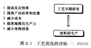 工艺优化的目标随项目早期的工艺研发、放大直至投产的成功进展而发生变化(图8.1)。工艺优化的先后顺序可能根据工艺的性质而有所不同。例如,-个产生过量废物的生产工艺过程,则在中试之前需要先进行工艺优化以期降低废物产量。所有工艺研发的最初目的都是为了在相应的反应条件下使产品的产量最大化。这就需要反应尽量完全,也就是所有起始原料都消耗到最低量,并且其副产物尽可能少。一旦工艺进程中的每一步产量都得以优化,则获取最大产率的分离产物就可能成为现实。