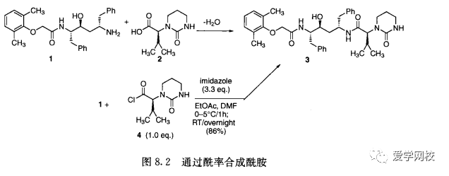 杂质的存在可导致产品的纯化困难和产率降低。特别是在原料药的制备过程中,难以除掉的杂质会增加最后步骤的成本。例如,胺类化合物1和羧酸类化合物2的缩合反应(图8.2) 不能有效进行,羧酸2会有较大部分的剩余,而过量的2使原料药3的纯化特别困难,收率也特别低。为了克服纯化困难的难题,可使用酰氯4来高效完成该反应。[1]