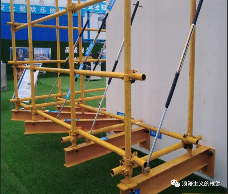 工字钢安装时,卡紧钢梁,确保工字钢固定牢固。搭设首步脚手架过程中,沿四周每框架格内设一道斜支撑,拐角处双向设置,待该部位脚手架与主体结构的连墙件可靠拉结后方可拆除。
