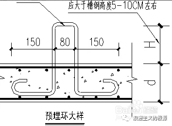 锚环预埋:采用ф16圆钢按图制作锚环,并在混凝土浇筑前按槽钢布置图完成锚环预埋安装,浇筑混凝土过程中注意保护,避免移位,对被破坏部分及时恢复。ф12圆钢用于预埋外架的拉杆固定。注意每根槽钢保证有两个锚环进行固定,严禁采用单锚环