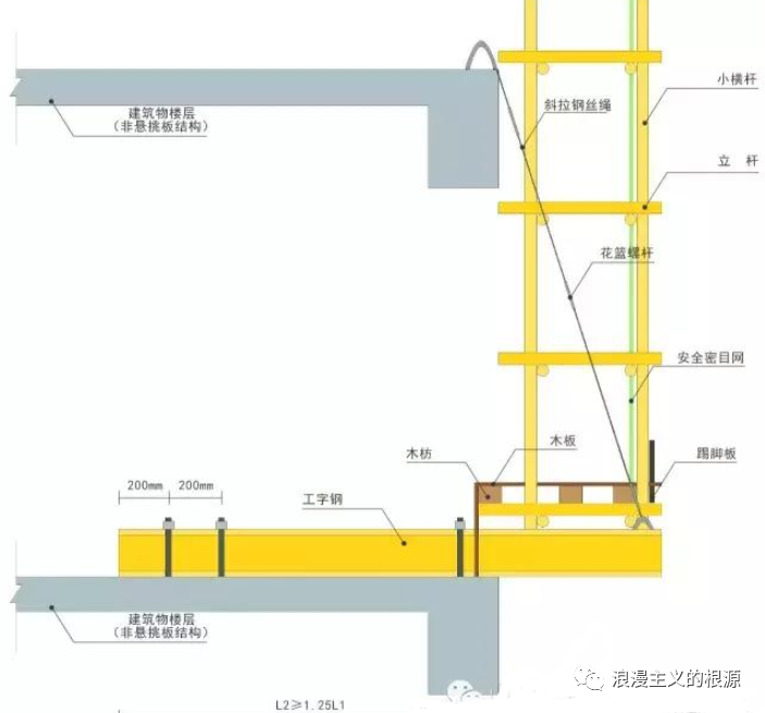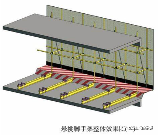 工艺流程:施工准备→放线定位→预埋圆钢锚环→悬挑架的支承结构安装→竖立杆→将纵向扫地杆与立杆扣接→安装横向扫地杆→安装纵向水平杆→安装横向水平杆→安装连墙件→安装剪刀撑→扎色带及张挂安全网→作业层铺脚手板和挡脚板。