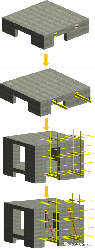 对工字钢穿剪力墙时,在穿墙洞口位置对槽钢用聚苯板包裹做保护处理,便于今后拆除,同时按设计规范要求设置加强钢筋对剪力墙进行加强处理。