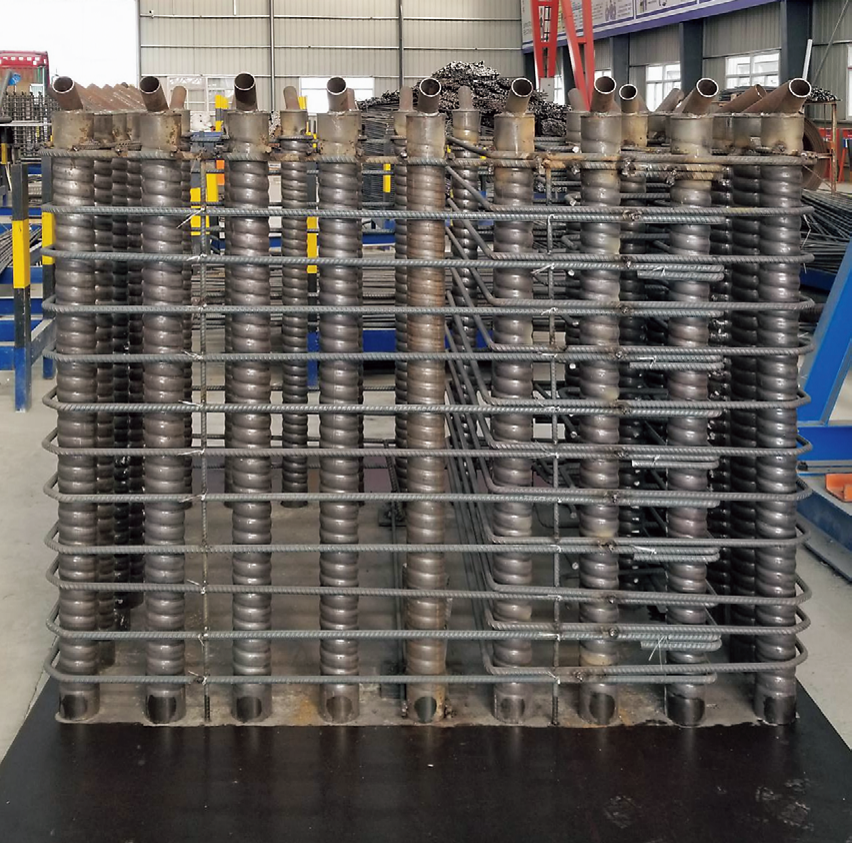 ⑵ 承台拼接面钢筋预埋。为了使承台预埋钢筋与预制立柱中的套筒所匹配,应采用与套筒配套的定位胎具来定位承台钢筋。在浇筑混凝土前,应对承台预埋钢筋的高程、角度及相对位置进行测量复核,主筋的平面位置允许偏差为 2mm。浇筑混凝土时,应减小混凝土对预埋钢筋的冲击,成形后混凝土面平直度应在2mm 以内。