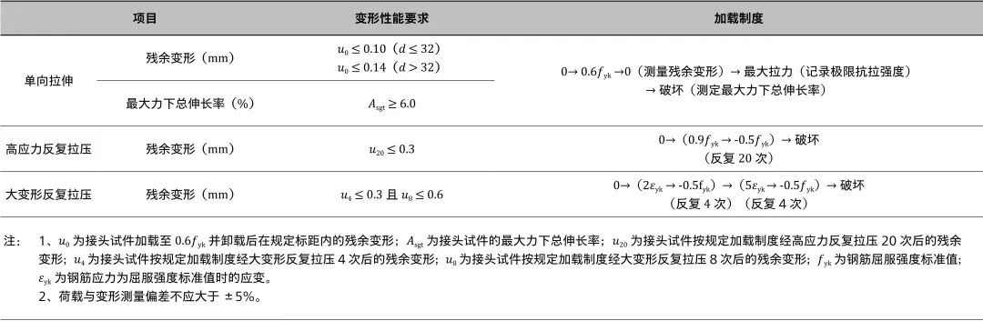 高应力与大变形条件下的反复拉压试验是对应于风荷载、小地震和强地震时钢筋接头的受力情况提出的检验要求。在风载或小地震下,钢筋尚未屈服时,应能承受 20 次以上的高应力反复拉压,并满足强度和变形要求。在接近或超过设防烈度时,钢筋通常都进入塑性阶段并产生较大塑性变形,从而能吸收和消耗地震能量;机械连接接头在经受反复拉压后易出现拉、压转换时接头松动,因此要求钢筋接头在承受 2 倍和 5 倍于钢筋屈服应变的大变形情况下,经受(4~8)次反复拉压,满足强度和变形要求。具体变形性能要求见表 2。