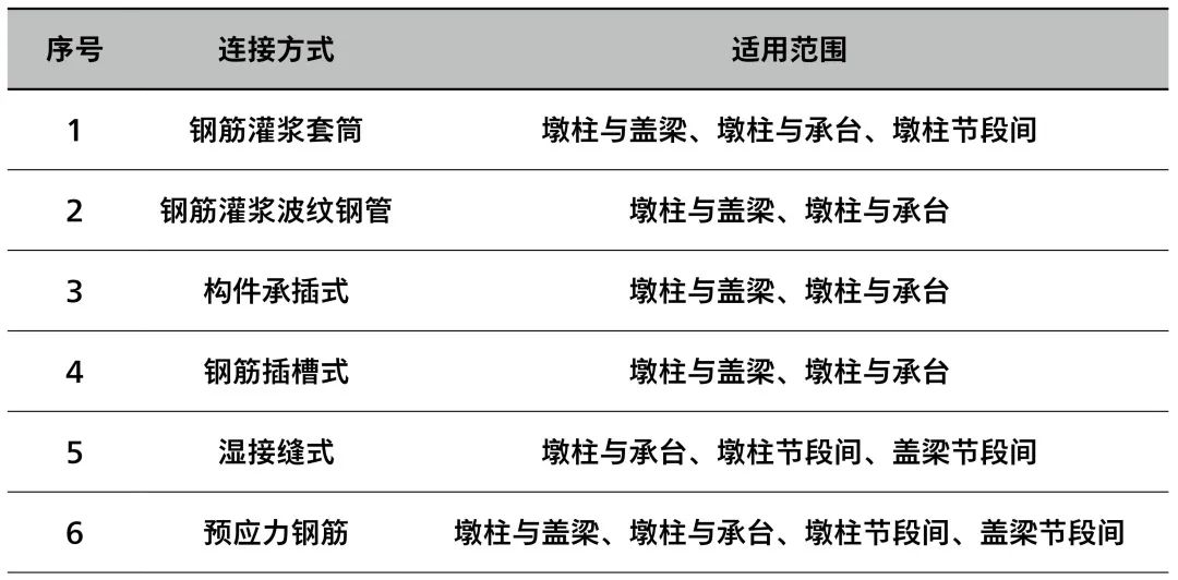 目前国内外采用的装配式混凝土桥墩连接方式有钢筋灌浆套筒、钢筋灌浆波纹钢管、构件承插式、钢筋插槽式、湿接缝式、预应力钢筋、钢板连接、焊接连接等多种形式。装配式混凝土桥墩预制节段的连接方式可根据结构形式、施工条件等因素按表 1 确定。