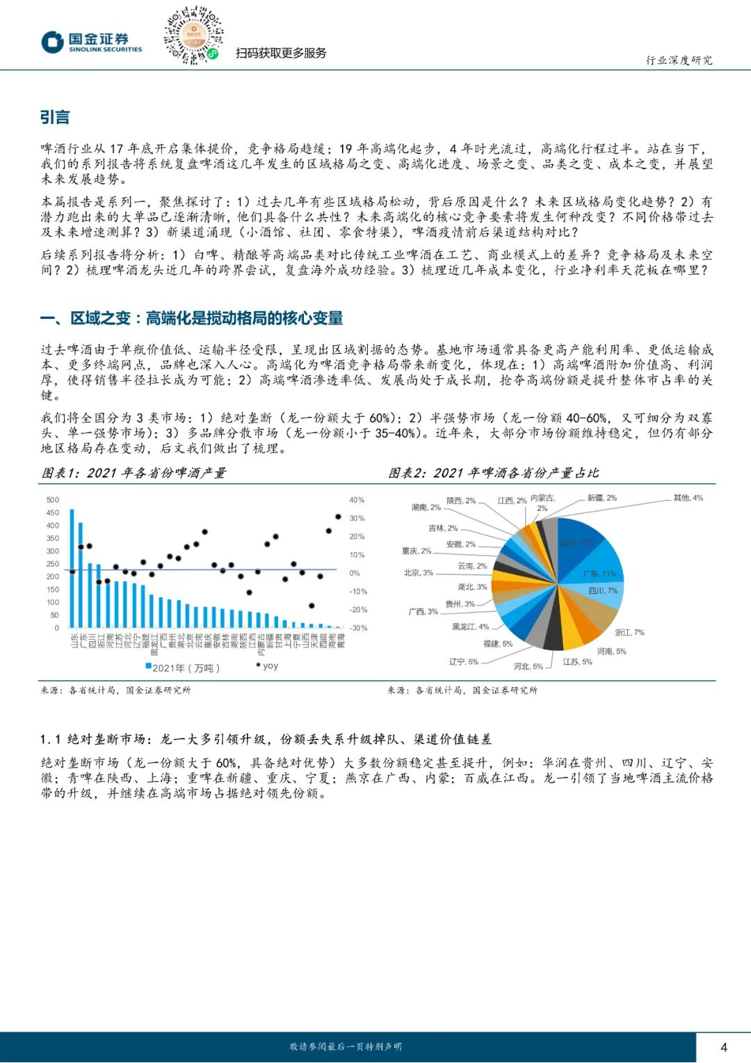 啤酒行业从17年底开启集体提价,竞争格局趋缓;19年高端化起步,4年时光流过,高端化行程过半。站在当下,我们的系列报告将系统复盘啤酒这几年发生的区域格局之变、高端化进度、场景之变、品类之变、成本之变,并展望未来发展趋势。