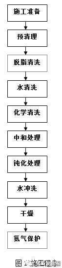 本标准适用于工业金属管道工程中设计文件规定的需要进行化学清洗的管道施工。本标准不适用于工业金属管道工程中用水冲洗和油清洗的施工。下列文件中的条款通过本标准的引用而成为本标准的条款,凡是注日期的引用文件,其随后的修改单(不包括勘误的内容)或修订版均不适用于标准,然而,鼓励根据本部分达成协议的各方研究是否可使用这些文件的最新版本。凡是不注日期的引用文件,其最新版本适用于本标准。GB 50235 《工业金属管道工程施工及验收规范》 SH/T3517 《石油化工钢制管道工程施工工艺技术规程》所有用于工业管道化学清洗的化学清洗药品必须具有出厂质量合格证明书,其化学成分和特性必须符合有关标准的要求。用于现场临时接管的管子及其配件、材料宜采用不锈钢或塑料制品。用于现场盛接清洗化学药品的容器应采用不锈钢或塑料制品。设备:耐酸泵、不锈钢水槽、水泵、空压机、清洗质量检查用黑光灯、YX—125携带式萤光探伤仪(功率125W)等。用于浸泡法和擦洗法使用的工器具有塑料桶、盆、不锈钢刷、毛刷以及橡胶手套、口罩等必备的劳动保护用品。5.2.1 临时配管口径,原则上主管直径小于100mm,支管直径与正式管径相同;管道内表面有明显油斑时,不论采用何种酸洗方法,酸洗前应进行必要的预除油处理,一般采用5%的碳酸钠溶液清除油污或用四氯化碳(或三氯乙烯)进行脱脂处理。同时检查焊缝质量,如有较大焊瘤及焊渣等,应加以处理。5.4.1可采用槽浸法或系统循环法进行酸洗,酸洗液应按规定的配方按顺序进行配制,并应搅拌均匀。酸洗液、中和液及钝化液的配方,当设计未规定时,按表1和表2的规定配制使用。系统循环法即用酸泵向管内边灌酸液,边排空气,排净空气后再进行循环,酸洗的操作温度和持续时间,应根据锈斑去除情况而定,一般情况持续6—8小时,酸洗液温度为70℃左右。5.4.2 酸洗过程中,应定期分析酸洗液的成分并及时补充新液,当除锈效果明显下降时,应予以更换。酸洗排净后,接上中和液胶管,用泵动态进行管内残存酸液的中和。在排放口用PH试纸检查,当溶液呈中性或弱碱性时,即停止中和。酸洗、中和合格后,接上钝化液胶管,启动泵向管内灌送钝化液,边灌边排空气,使钝化液在管内循环半小时后,再静态2小时后排放干净。5.7.1 钝化后,开启水泵用洁净水冲洗循环系统。5.7.2 干燥:水冲洗后,立即用干燥气吹扫循环系统,直至管道内残液全部排净。5.7.3 水冲洗合格后,用干燥无油空气或氮气彻底吹干管内壁,碳钢管内壁呈银灰色认为合格。5.7.4 在完成系统吹扫干燥后,应在短时间内拆除临时管线,并将拆除的管道附件恢复。如果距调试、开车时间较长,待管道系统恢复后,在系统内充O.07Mpa的氮气对管道系统进行氮封保护。5.7.5 对于小型管段,管件等可采用浸泡法清洗,清洗时将管段、管件直接放入各溶液槽中,其步骤与循环清洗一样,经酸洗、中和、钝化、水洗、干燥后组装,根据需要进行充氮保护。6.1 管内表面或清洗件表面无铁锈和氧化斑迹,无杂质、水垢并呈金属光泽。6.2 酸洗后的管道以目测检查法以管道内壁呈金属光泽为合格。6.4 钝化的质量以蓝点检验法检查钝化膜致密性。用检验液一滴点于钝化表面,15min内出现的蓝点,少于8点为合格。见表3。7.1 为获得良好的清洗质量,使化学清洗溶液在一定流速下对管内壁产生冲蚀最佳效果,应选用大扬程大流量耐蚀泵使溶液在一定压力下对整个回路管道进行循环清洗。7.2 酸洗时,管内排空很重要,一定要使管内不产生气囊,否则该处铁锈洗不到,会严重影响酸洗质量。7.3 酸洗液和钝化液要经常检查其浓度,应始终保持规定的浓度,否则影响处理效果。7.4 应严禁酸液与中和液、钝化液相混合,尤其钝化液,否则将产生有毒的二氧化氮气体,影响操作人员身体健康。7.5 酸洗完成后应随即进行钝化,钝化完毕随即密封,中造不能停顿,以免管内再次氧化。7.6 所有清洗合格的管道及其附件不得损坏,如不能及时进行管道系统复位,必须用塑料布进行包封。7.7 复位后,要求氮封时,应及时在系统内充氮气,并将系统内空气置换完,每系统应设置两块以上的压力表监视氮封压力。为保证氮封效果,应设立专人进行定时检查,当系统内氮气压力低于0.05Mpa时,应及时补充氮气,并保证氮气压力在0.07—O.1Mpa。