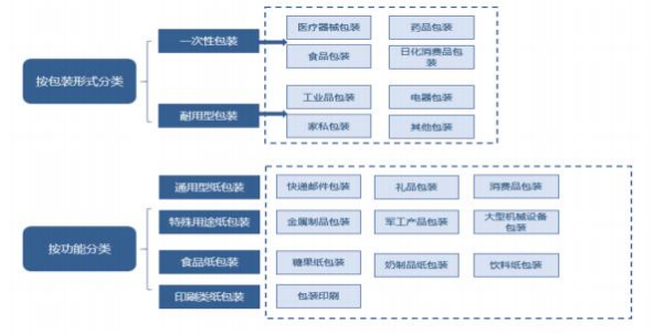 纸制品包装按包装形式主要分为一次性包装和耐用型包装,按照功能分类主要分为通用型纸包装、特殊用途纸包装、食品纸包装以及印刷类纸包装,具体如下: