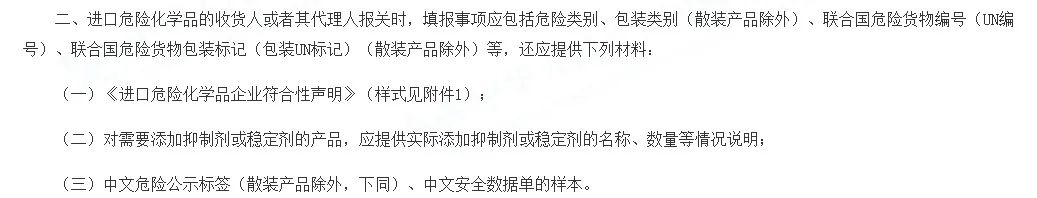129号公告的第二条强调了进口危险化学品收货人的安全责任,明确规定了在报关时,需如实填报危险类别、包装类别(散装除外)、联合国危险货物编号(un编号)、联合国危险货物包装标记(包装un标记)(散装除外)。2020年12月24日,单一窗口发布了关于规范进口危险化学品申报的通知。自2021年1月10日起,hs编码涉及危险化学品的产品必须在“货物属性”栏勾选“散装危险化学品”、“件装危险化学品”和“非危险化学品”中的一项才可继续申报。同时对“危险货物信息”栏填写进行规定。