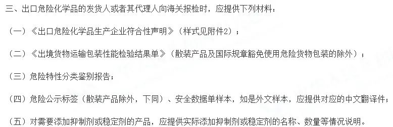 129号公告第三条第(二)条款新增了豁免条款,如果出口危险化学品符合国际规章(例如,联合国《关于危险货物运输的建议书 规章范本》、《国际海运危险货物规则》等)中免予使用危险货物包装的要求,在申报时无需提供《出境货物运输包装性能检验结果单》。变化四:明确了企业主体责任