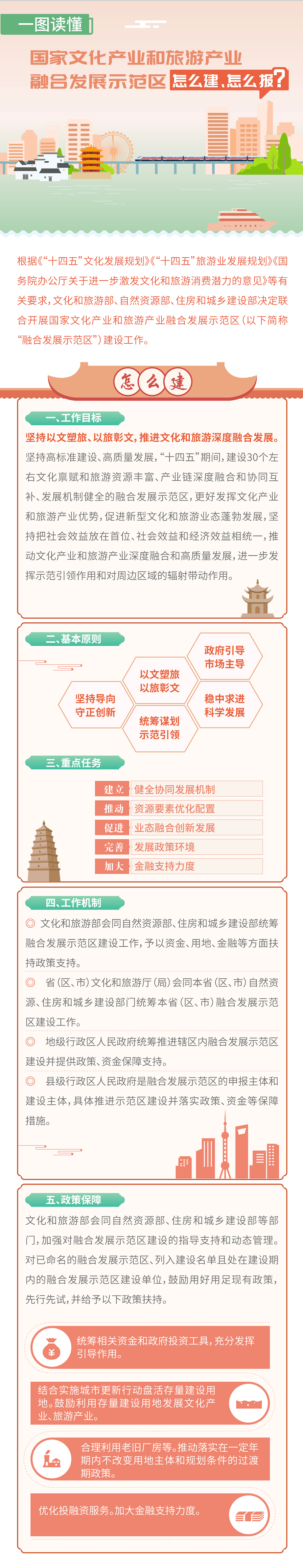 为深入贯彻党的二十大精神,坚持以文塑旅、以旅彰文,推进文化和旅游深度融合发展,完善文化和旅游融合发展体制机制,根据《“十四五”文化发展规划》《“十四五”旅游业发展规划》《国务院办公厅关于进一步激发文化和旅游消费潜力的意见》等有关要求,文化和旅游部、自然资源部、住房和城乡建设部决定联合印发《关于开展国家文化产业和旅游产业融合发展示范区建设工作的通知》(以下简称《通知》),开展国家文化产业和旅游产业融合发展示范区(以下简称“融合发展示范区”)建设工作。