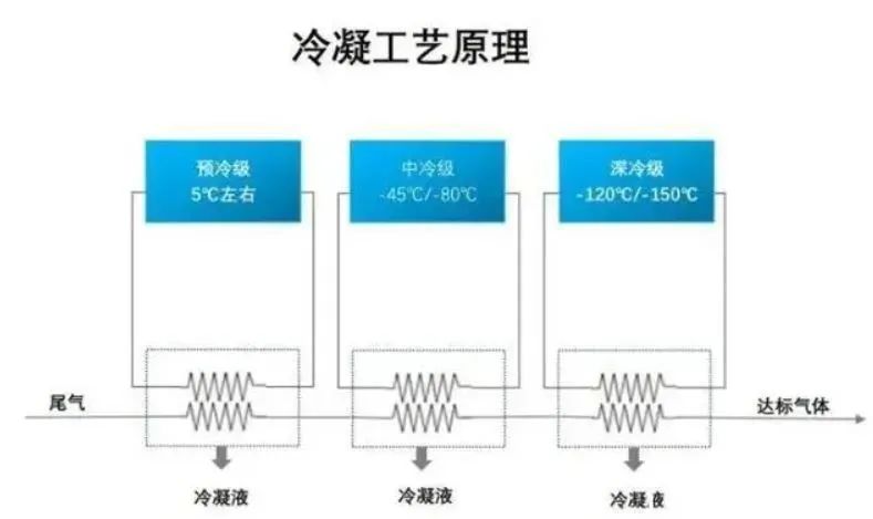 冷凝法在理论上可达到很高的净化程度,但是当其浓度低于较低时,需采取深度冷冻,这将使运行成本大大提高。通常在VOCs的处理中,冷凝可作为焚化、洗涤、吸附等的前置处理步骤。
