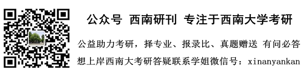 公众号:西南研刊 专注于为考生提供准确真实的西南大学本校内部考研信息,长期发文告知西南大学考生考研防套路知识,传授各专业考研经验技巧,上岸研究生免费答疑(微信号:xinanyankan)西南大学考研导师信息群:893750823