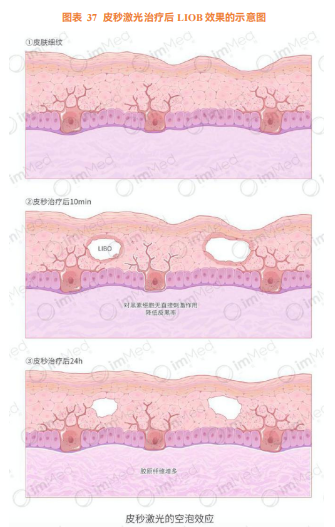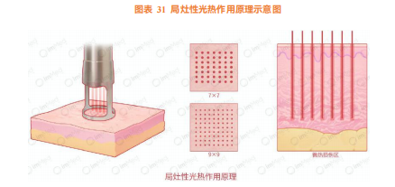 足够引起靶色基热损伤的能量。当激光的能量足够大时,靶组织将会被热能摧毁,摧毁的形式依照能量的高低、色基的不同、作用时间的快慢、光源的不同,可以是崩解、热变性、坏死、气化等。选择能在靶组织上产生足够的温度,使之破坏的合适的能量是保证疗效的前提。连续激光的能量密度(J/cm2)=(功率×时间)/光斑面积,相同光斑面积,相同功率,光的作用时间越长,能量越大,损伤越大。而对于脉冲激光:能量密度(J/cm2)=能量/光斑面积,能量大小不影响穿透深度,但会影响不同界面能量的分布。小于或等于靶组织的热弛豫时间。热弛豫时间(TRT)是指受热的靶组织通过热扩散将其吸收的能量降低 50%所需的时间,大多数靶组织可以采用简单的经验算法 TRT≈d2(近似值),TRT 以秒(s)为单位,d 代表靶点大小,以毫米(mm)为单位。靶色基的热向周围组织发生的这种热传导的过程就是热弛豫,而衡量热弛豫速度的快慢就是热弛豫时间,实际上就是衡量组织冷却的快慢。根据光学理论,只要使激光的脉冲持续时间小于或等于靶组织的热弛豫时间,就不会引起周围组织的热损伤。其中色素性病变中黑色素颗粒非常微小(0.2-0.5μm),其 TRT(0.25μs)<1μs,因此治疗色素性病变应使用脉宽为纳秒级甚至皮秒级的激光。因此要产生选择性光热作用效应,必须具备有三个基本条件:1、被靶色基优先吸收的波长;2、小于或等于靶组织热弛豫时间的脉冲持续时间;3、足够引起靶色基热损伤的能量。2、扩展的选择性光热作用原理对于脱毛和皮肤血管性疾病的治疗热损伤时间(TDT)是指靶色基吸收光能转化为热能后,将热能传导至远处的靶组织并引起损伤的时间,即整个靶组织包括黑色素及毛囊冷却约 63%的时间,这个时间要长于热弛豫时间,这一理论被称为扩展的选择性光热作用原理,是选择性光热作用的一个重要补充和扩展,强调对靶色基以外靶组织的治疗需要考虑组织的热损伤时间。对于脱毛和皮肤血管性疾病的治疗,激光治疗的靶目标并不是靶色基(黑色素和血红蛋白),仅利用选择性光热作用原理不能达到治疗预期。因为脱毛治疗的靶色基是黑色素,而治疗的靶目标是毛乳头和毛囊干细胞,两处均不含黑色素。同理,激光治疗血管时,靶色基是血红蛋白,而需要治疗的靶目标是血管内皮细胞,所以按照选择性光热作用原理,治疗所用的激光能量是相对不吸收的,激光对治疗靶组织也相对无作用。在脱毛治疗中,治疗的靶色基(黑色素)存在于毛干和毛鞘内,毗邻毛囊的生长部位毛乳头和毛囊隆突部位的毛囊干细胞。为达到理想的脱毛效果,激光的能量除了要破坏毛发本身外,还应破坏毛囊中的生发部位,因此治疗时需要将脉冲宽度适当延长,使得毛干及毛鞘内的黑色素因为吸收光能所产生的热能有充足的时间扩散到邻近的毛囊隆突部位和毛根部,使毛囊干细胞或者毛乳头生发部位发生不可逆地损伤。同理,在皮肤血管性疾病的治疗中,治疗的靶色基(血红蛋白)位于血管内,毗邻血管壁的血管内皮细胞,激光的能量被含氧血红蛋白吸收后产生的热能传递至血管壁邻近区域的时间需长于靶组织的热弛豫时间,才能起到治疗的作用,这就是临床上用长脉宽或者超长脉宽激光治疗血管性皮损的基础。因此,要想达到损害靶组织(毛乳头和毛囊干细胞、血管内皮细胞)的目的,需要一个较长的脉冲宽度以便使激光的能量有足够的时间从靶色基(黑色素和血红蛋白)传导到靶组织(毛乳头和毛囊干细胞、血管内皮细胞)中。扩展的选择性光热作用的脉冲宽度和靶目标。光与组织的作用时间延长,靶组织的清除效果增加,但势必增加非靶组织的损伤,这是因为当组织的靶色基吸收激光的能量后,转化为热能,必定会向周围邻近组织发生热传导。热传导的多少与激光的脉冲持续时间成正比,时间越长,热损伤的范围就越大。对于毛囊、异常血管等靶目标,需要根据其大小来推算其热弛豫时间,并采用相应的激光器与脉冲宽度。对于血管性皮肤病,激光作用于血管的时间必须足够长,以便热传导从血管腔的红细胞到整个血管壁。3、局灶性光热作用原理可使皮肤重塑紧致,改善面部年轻化选择性光热作用原理是提高靶组织对光热吸收的同时降低光热对非靶组织的损伤。应用于面部年轻化的治疗时,其靶色基是水,其吸收激光能量后转化为热能,引起所在真皮组织的热损伤,进而启动真皮组织的修复再生过程,达到皮肤重塑紧致功效,即通过对真皮组织损伤后的修复达到年轻化的目的。为了增强激光对真皮组织的刺激同时尽可能减少损伤带来的副作用,局灶性光热作用原理应运而生。2004 年,哈佛大学的 Rox Anderson 博士等人共同提出了局灶性光热作用,也称点阵式光热分解作用。它是将一个激光光斑均匀地分成相同直径大小的小光斑,在小光斑上作用的能量密度很高,可以穿透表皮,甚至到达真皮层,产生不伴有周围组织损伤的微热损伤区或称显微剥脱区,从而在保证疗效的前提下,降低治疗后的副作用。剥脱性和非剥脱性点阵激光。基于局灶性光热作用原理,点阵激光(fractional laser)治疗模式被设计出来。其光束排列成点阵状,并对皮肤真皮组织进行强热刺激,从而成为一种新型的激光治疗模式。目前,该类激光分为非剥脱性和剥脱性两类。前者被水轻度吸收,不会损伤表皮角质层,表皮组织凝固但不气化,激光光束仅仅引起一个柱状的热变性区域(并非真