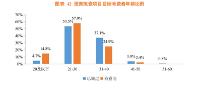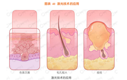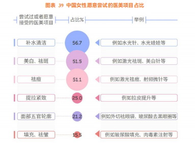 近十年来,明星及网红文化迅速发展,大众对外貌的关注度提升,民众变白变美的诉求愈加强烈。传统的美白护肤产品只能到达表皮层,由表及里,专注祛除黑色素,但这种方法只能针对祛除表皮层的黑色素,对真皮层的色素无能为力,而且无法抑制黑色素的根源分泌,所以只能达到表面白、暂时白的效果,一段时间后黑色素就会卷土重来。随着轻医美时代的来临,一些祛斑医美项目可作用于皮肤表皮层以下解决色素问题,祛斑美白的优势凸显。此外祛斑医美项目无需开刀,安全性高,打消了诸多想变美但恐惧手术消费者的顾虑,同时因祛斑美白效果显著而备受民众青睐。祛斑医美项目均为无创或微创的,恢复时间短,不会影响消费者的正常工作生活,促使当前更多的求美者选择祛斑医美项目,导致祛斑美白医美器械需求不断提升,市场发展潜力大。容貌焦虑问题突出,改善肤质的求美者越来越多。肤质问题主要包括痤疮、毛孔粗大以及由于各种炎症性疾病遗留的细小凹陷性瘢痕等。例如痤疮即大家熟知的“青春痘”“痘痘”,是毛囊皮脂腺的慢性炎症性皮肤病,主要好发于青少年。据悉,全球痤疮患者人数超过 6.4 亿,超过 95%的人在一生中不同时期会发生痤疮。痤疮反复、瘢痕遗留、皮肤敏感等问题,严重影响患者的容貌和心理健康。中国青年报面向全国各地大学生开展的问卷调查,共回收 1049 份有效问卷,结果显示大学生遇到最多的皮肤问题是痤疮、暗疮或粉刺,占比 63.21%,同时皮肤问题带来的困扰首先是影响个人形象,占比 75.47%,造成一些大学生心理上的困扰,引发容貌的焦虑,42.19%受访者希望通过医美解决青春痘、过敏等皮肤问题。随着轻医美时代的来临,预计医美在年轻消费者中的渗透率将不断提升,未来通过医美项目解决容貌焦虑问题,改善皮肤质量的求美者将越来越多。虽然日常护肤已经满足了大部分女性的需求,但女性有许多难以解决的皮肤问题,也有对更高层次好皮肤的渴望。医美为这些女性提供了新的选择,越来越被接受和青睐。根据网易数读、浪潮工作室联合调研数据显示,补水清洁、美白祛斑和祛痘,是大家最愿意尝试的医美项目,占比均超过了一半,这些项目创伤较小,恢复期快,短期内易见明显成效。消费者需求的增加,也将带动对应适应症的医美激光器械的快速增长。例如,长脉宽 1064nm 激光能够穿透表皮,直达深层皮肤,产生独特的光-生物效应,有效杀灭厌氧性痤疮丙酸杆菌,达到抑制痤疮的作用。此外,对于肤质问题的毛孔粗大,2022 年 8 月,权威医学杂志LIMS发表的一篇长脉宽1064nm激光和非剥脱点阵在治疗面部毛孔粗大的安全性和有效性对比研究报告显示,两种激光对面部毛孔粗大的治疗效果相似,治疗后的毛孔数量都有明显下降,长脉宽 1064nm 激光的副作用比 1565nm 非剥脱点阵激光更小5。此外皮秒激光对于毛孔粗大也有着非常显著的临床效果。皮秒激光产生的光声效应(光机械效应),光声效应在皮肤的表皮层和真皮层中形成空泡,可以刺激成纤维细胞增殖,产生新的胶原蛋白、弹力纤维及黏蛋白等,诱导皮肤组织再生及重塑,从而达到治疗毛孔粗大的作用。“全民露脸”的时代,越来越多求美者追求皮肤年轻化。美是人类永恒的追求。随着自媒体、新媒体的普及,当今社会已成为“全民露脸”的时代,爱美女性对面部年轻态的重视程度日渐提升。但由于环境的变化、生活节奏的改变和生活压力的增大,面部初老日渐低龄化。根据新氧数据颜究院联合新华财经发布的《2021 中国医美抗衰消费趋势报告》,报告显示,59.2%的人在 20-30 岁就开始对衰老产生了压力,19.64%的 20-25 岁青年人对衰老感到“非常焦虑”。在身体机能衰老问题中,皮肤松弛、身材变形、白发与脱发成为大众最为关注的三大问题。从医美抗衰消费者年龄分布来看,消费群体呈现年轻化的格局。在体验过医美抗衰项目的人群中,超过九成的消费者年龄在 21-40 岁之间,其中 21-30 岁的人群占比最高,达到了 53.5%。越来越多的年轻群体对医美抗衰项目产生兴趣,在体验过医美抗衰项目的消费者中,20 岁及以下人群占比仅有 4.7%,而在有意向体验医美抗衰项目的群体中,年龄在 20 岁及以下的占比达到了 14.8%,更多 20 岁以下的年轻人提前关注了医美抗衰项目,不难看出,医美抗衰目标消费群体进一步年轻化的态势。▲ 来源:《2021 中国医美抗衰消费趋势报告》,蛋壳研究院新时代女性对于变美、变年轻的要求却越来越高,可概括为“多、快、好、省”,即“作用广、治疗操作快-恢复快、效果好、费用合理-创伤小”。甚至 95 后的求美者,都开始谋划着“抗初老”,在市场的教育下,年轻一代的求美者也逐渐自然而然地习惯了比手术更放心的水光针、皮秒激光、光子嫩肤、热玛吉等轻医美项目。在求美者追求皮肤年轻化的大背景下,预计将带动一些轻医美项目的快速增长。以皮秒激光为例,根据 2021 年 3 月知名医学杂志 LSM 上发表了一篇临床研究数据,使用 1064-nm单波长或 532/1064-nm 双波长 Nd:YAG 皮秒激光对患者的左右脸随机治疗,结果显示皮秒激光对改善皱纹,实现面部年轻化具有积极的治疗作用6。另外,根据皮秒激光临床应用专家共识显示,皮肤老化是指由自然因素或非自然因素造成的皮肤衰老现象,包括内源性和外源性两个方面。皮肤老化常伴随表皮变薄,真皮胶原减少,真表皮连接紧密性降低,真皮乳头