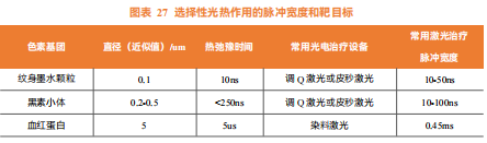 选择性光热作用原理是 1983 年 Rox Anderson 等人提出的,即根据不同组织的生物学特性,选择合适的激光参数(波长、脉冲持续时间、能量),达到有效治疗病变部位的同时,对周围正常组织的损伤最小。该理论的提出,实现了激光治疗的有效性和安全性的完美统一,是激光医学发展史上的里程碑。要取得选择性光热作用效应,必须具备三个基本条件:合适的波长、脉冲时间和能量。选择被靶色基优先吸收的波长。皮肤中主要的色基是黑色素、水和血红蛋白。不同色基对光的吸收峰值不一样:黑色素吸收峰值在 280-1200nm,并随波长增加而吸收减少;氧合血红蛋白吸收峰值有三个,即 418nm(蓝色)、542nm(绿色)及 577nm(黄色);水的最大吸收峰大于 2μm。此外,皮肤中的外源色素(如纹身的染料)也有各自的吸收峰值:红色染料对 510nm 和 532nm 的波长吸收良好;绿蓝色染料吸收 630nm、694nm 或 755nm 的激光;蓝黑色染料吸收 755nm 或 1064nm 的激光。因此选择一种被靶色基吸收,而周围组织相对不吸收的光源,这是选择性治疗非常重要的一步。
