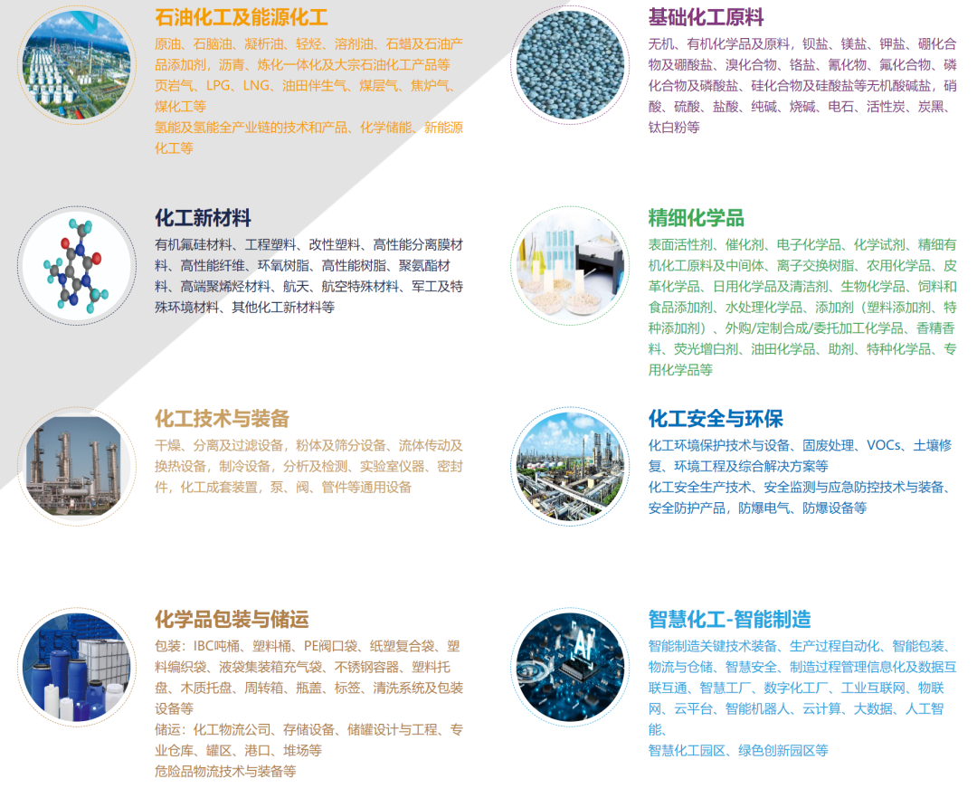✔“一站式”平台 - 展会涵盖石油化工和能源化工、基础化工原料、化工新材料、精细与专用化学品、化工技术与装备、化工安全与环保、化学品包装与储运、智慧化工-智能制造八大版块,覆盖石化行业全产业链,是您理想的“一站式”采购贸易平台。