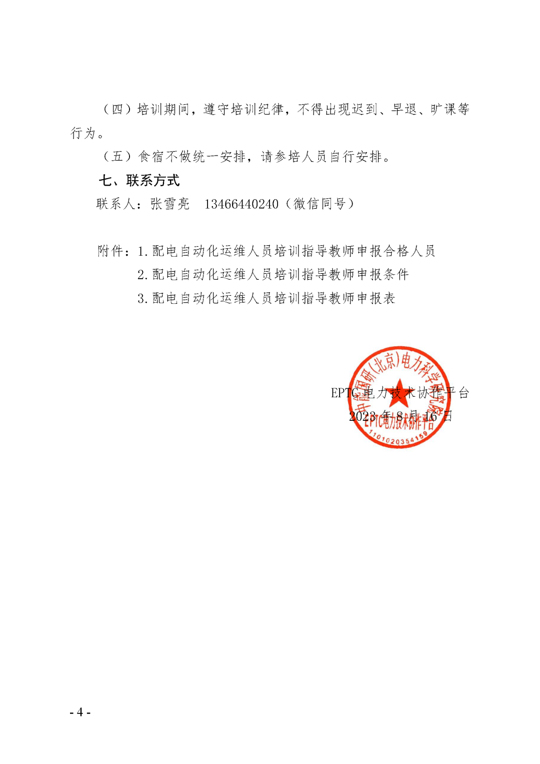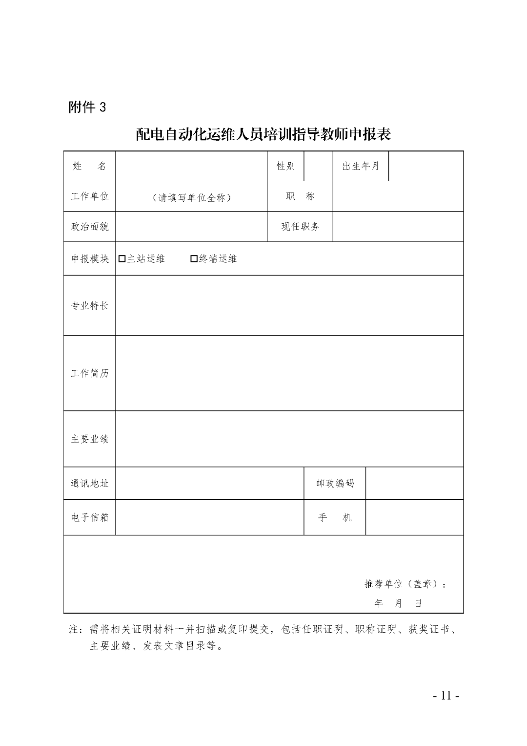 ?(一)《配电自动化运维人员培训考核规范》标准体系解读课程内容:中电联团体标准《配电自动化运维人员培训考核规范》及配电自动化运维教培体系建设工作讲解。课程内容:结合配电自动化主站运维与终端运维工作实际与案例开展课堂讲授及实操展示;配电自动化运维教培主题交流。课程内容:主要介绍教学组织技术,培训教学导入策略、展开策略、互动策略。 活动内容:对参训人员提前分组开展教学研讨交流,由小组依照培训任务,完成课程设计与课件制作,通过对课程展示与讲解,完成培训考核。 01 依据《关于开展配电自动化运维人员培训指导教师申报的通知(人才培训〔2023〕73号)》要求,完成申报并通过审核人员(见附件1)。 02 符合《关于开展配电自动化运维人员培训指导教师申报的通知(人才培训〔2023〕73号)》内申报条件(见附件2)的电力行业配电自动化运维专、兼职培训指导老师,可填写申报表并盖章后(见附件3),现场提交申报材料原件及扫描件。