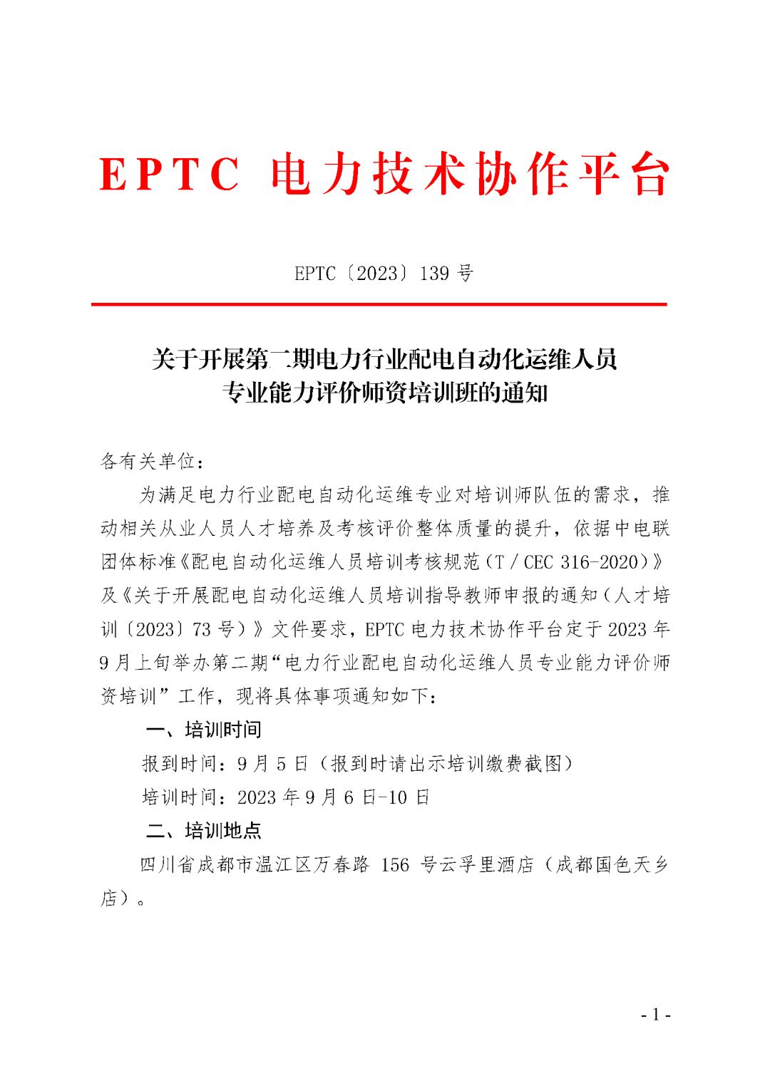为满足电力行业配电自动化运维专业对培训师队伍的需求,推动相关从业人员人才培养及考核评价整体质量的提升,依据中电联团体标准《配电自动化运维人员培训考核规范(T/CEC 316-2020)》及《关于开展配电自动化运维人员培训指导教师申报的通知(人才培训〔2023〕73号)》文件要求,EPTC电力技术协作平台定于2023年9月上旬举办第二期“电力行业配电自动化运维人员专业能力评价师资培训”工作,现将具体事项通知如下: