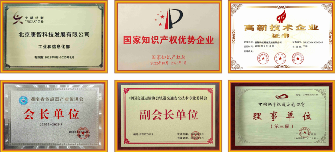 唐智科技,专业专注,核心技术团队有近50年的技术积累,建立全系化自主知识产权体系,通过近30年的工程应用积累,拥有有效专利200多项,其中有效发明专利近百项,登记软件著作权100多件,注册商标27件(含涉外注册商标3件),出版专著3部,发表论文近百篇,参与制定行业标准(规范)3项。通过了ISO9001、ISO14001和ISO45001三体系认证、ISO/TS22163轨道交通行业质量管理体系认证、EN15085轨道行业焊接质量管理体系认证、IpMS知识产权管理体系认证、CMMI能力成熟度等级3级认证,主要产品获得了CRCC认证、SIL认证;