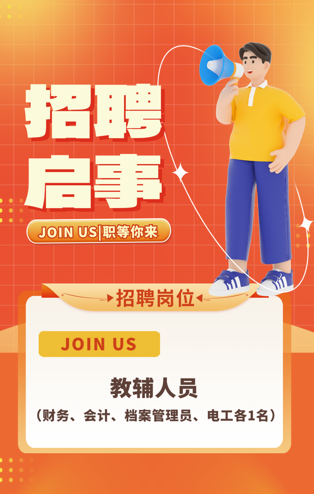 需招聘4名教辅人员(财务、会计、档案管理员、电工各1名)。
