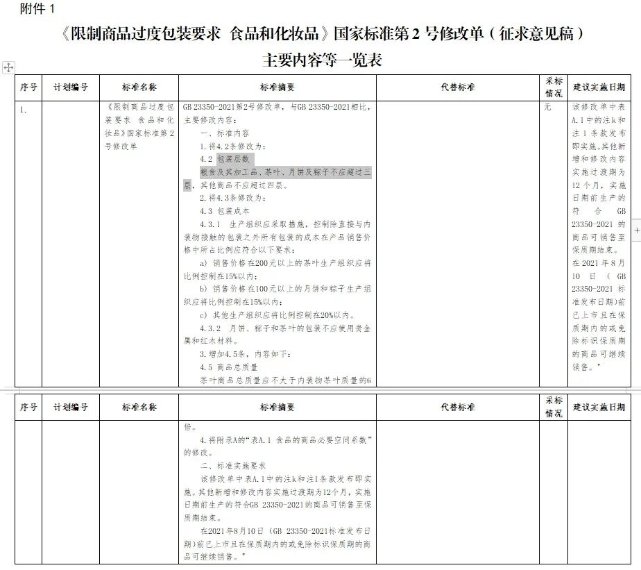 8月18日,工信部网站发布《公开征求对〈限制商品过度包装要求 食品和化妆品〉强制性国家标准第2号修改单(征求意见稿)的意见》。《修改单(征求意见稿)主要内容等一览表》中提到: