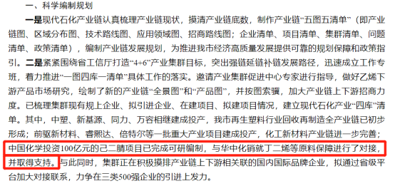 内容摘要:近日,岳阳市工信局对《关于高质量发展岳阳化工产业的提案》作出答复,其中提到:“中国化学投资100亿元的己二腈项目已完成可研编制,与华中化销就丁二烯等原料保障进行了对接,并取得支持。”