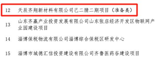山东省发改委发布《2023年省级重点项目调整名单》,其中包含中国化学的天辰齐翔新材料有限公司己二腈二期项目