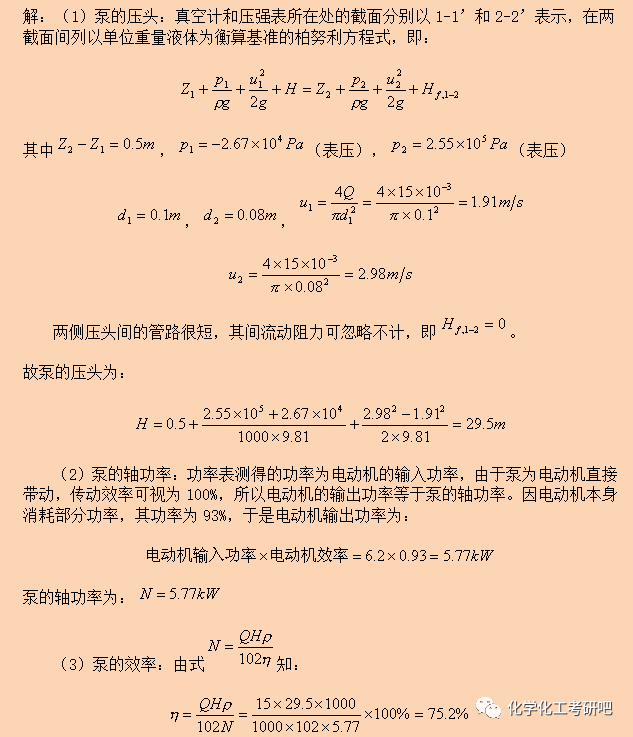 本题涉及到柏努利方程式的应用,流动阻力可忽略,在两截面间列以单位重量液体为衡算基准建立方程。在计算功率时,泵为电动机直接带动,传动效率可视为100%,所以电动机的输出功率等于泵的轴功率。