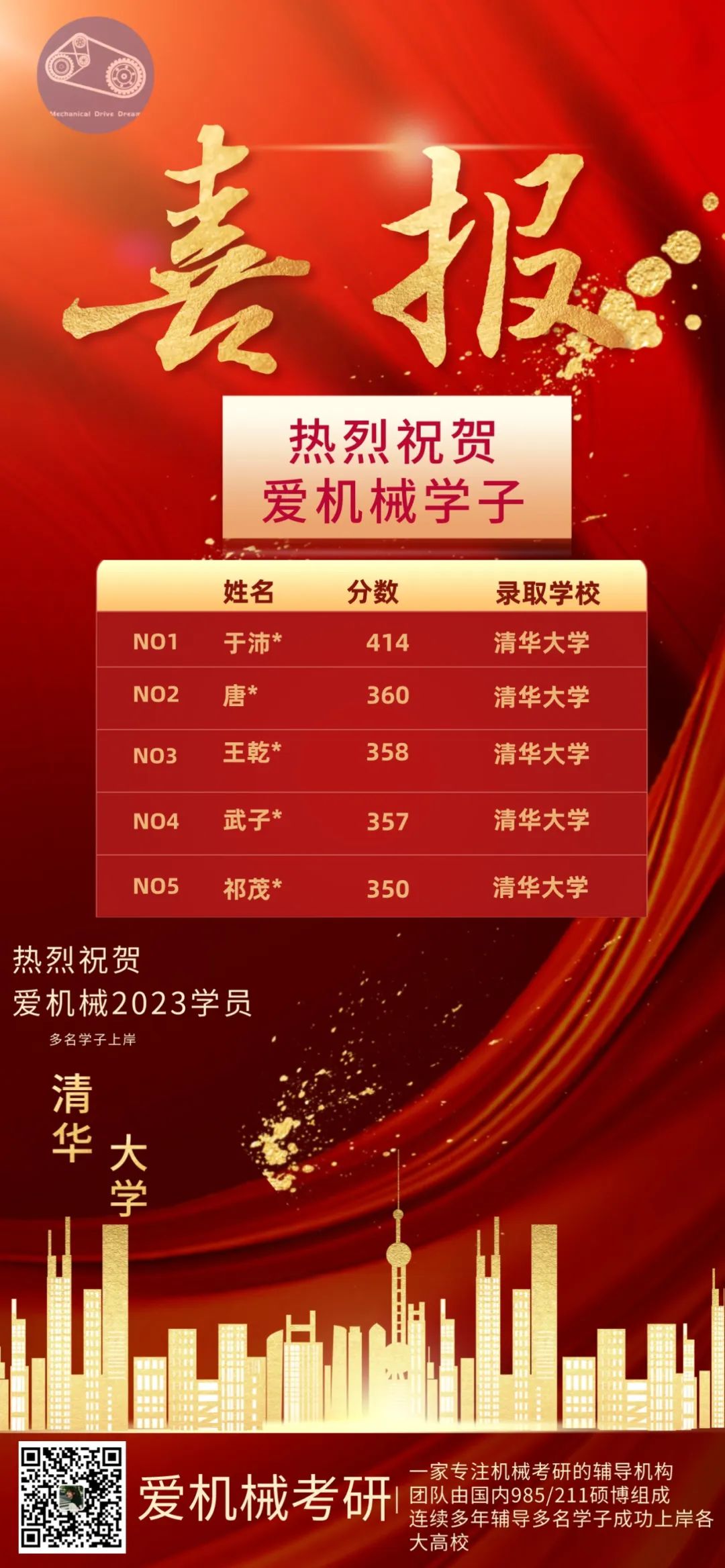 爱机械团队针对清华大学、华中科技大学、西安交通大学、上海交通大学、哈尔滨工业大学、武汉理工大学等985、211机械名校的精英小班课,正式开始招生!(各院校小班限8人以内,以下是23级清华小班战绩)