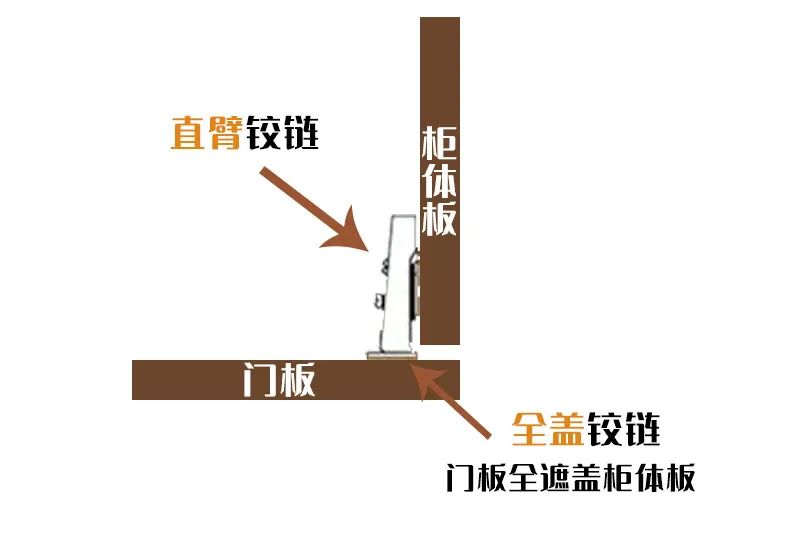 后便是全盖铰链,全盖铰链又被称为直臂铰链,一般用于柜体的中部,它的连接方式是门板将柜板全部遮盖,会使得柜体从正面看像是一个整体。由于,全盖铰链的开合角度较小,所以并不适合用在柜体的外侧。