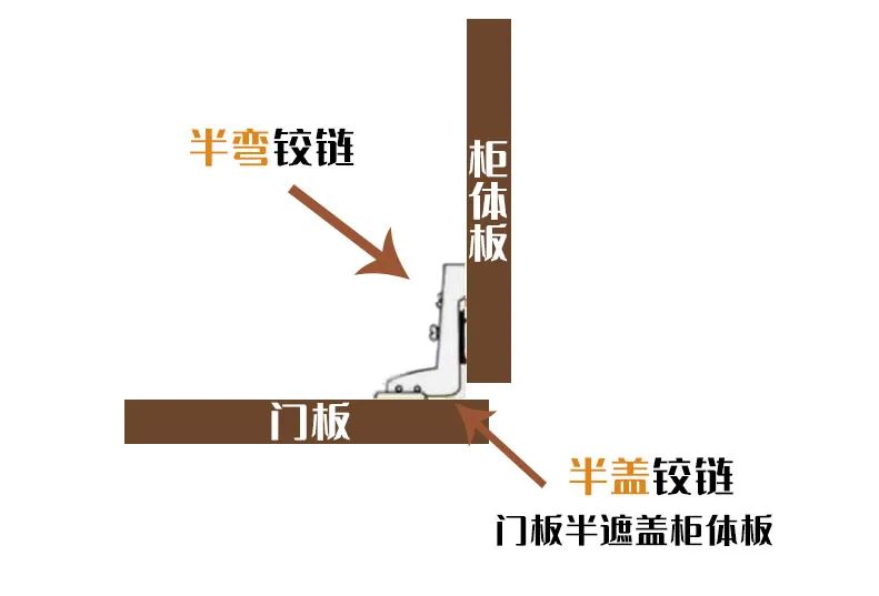 再者就是半盖铰链,半盖铰链又被称为半弯铰链,它即可用于柜体的中部,也可用于柜体的外侧,它的连接方式是门板盖住柜板的一半。