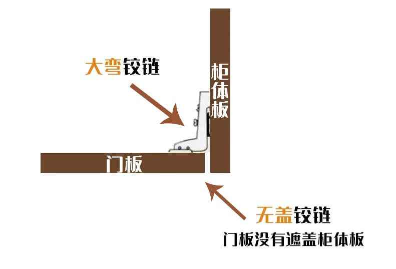 首先是无盖铰链,无盖铰链又被称为大弯铰链,一般用在柜体的外侧。它的连接方式是门板完全镶嵌在柜体板中,会显得更加整体美观。