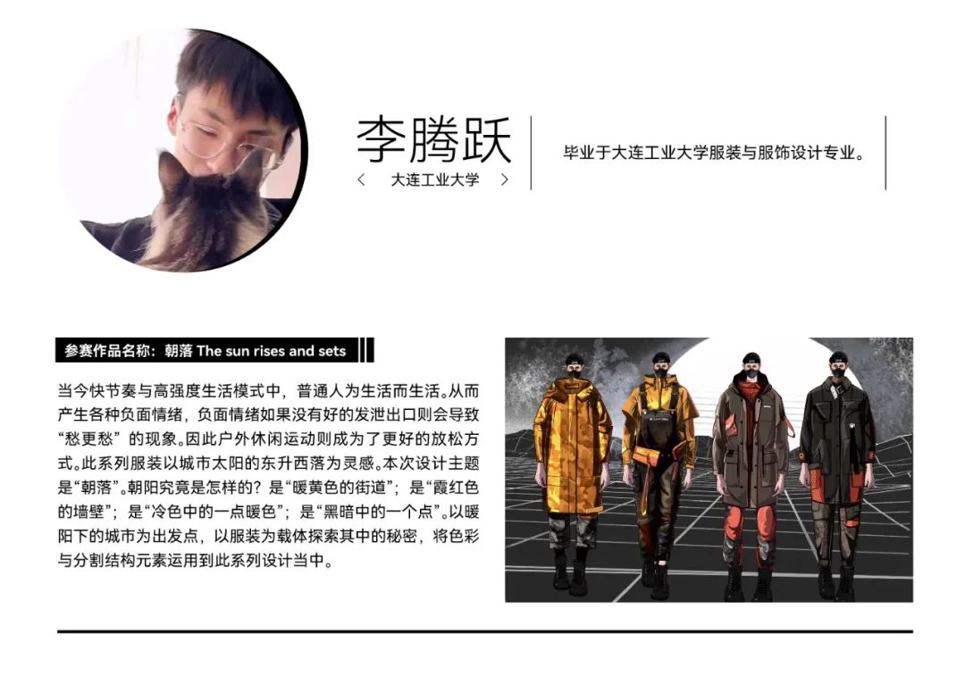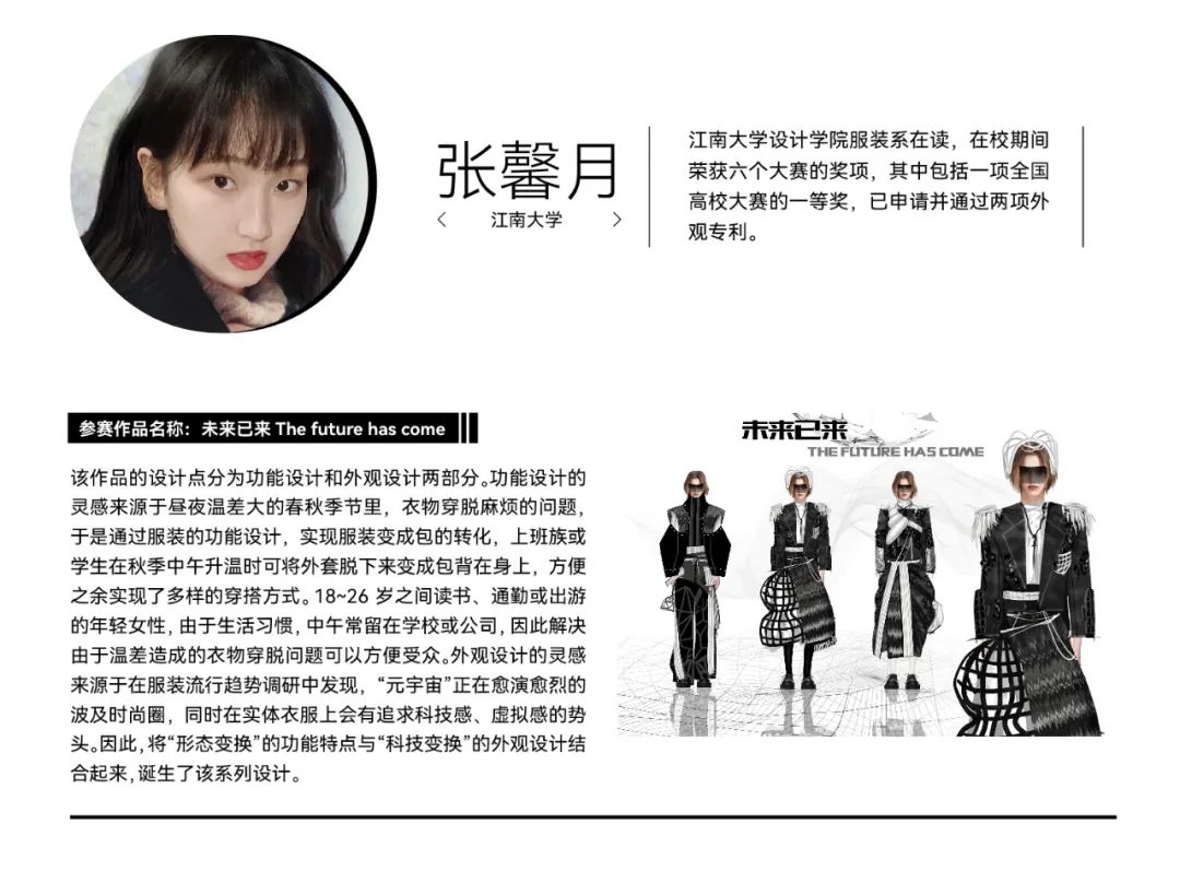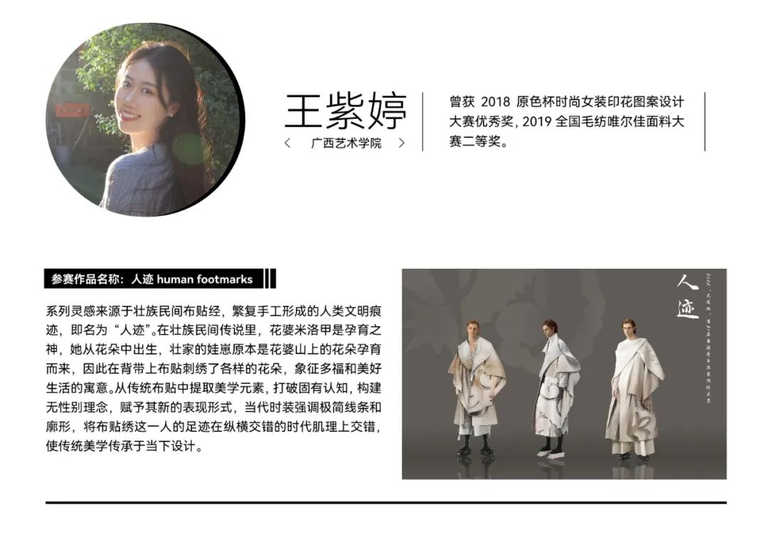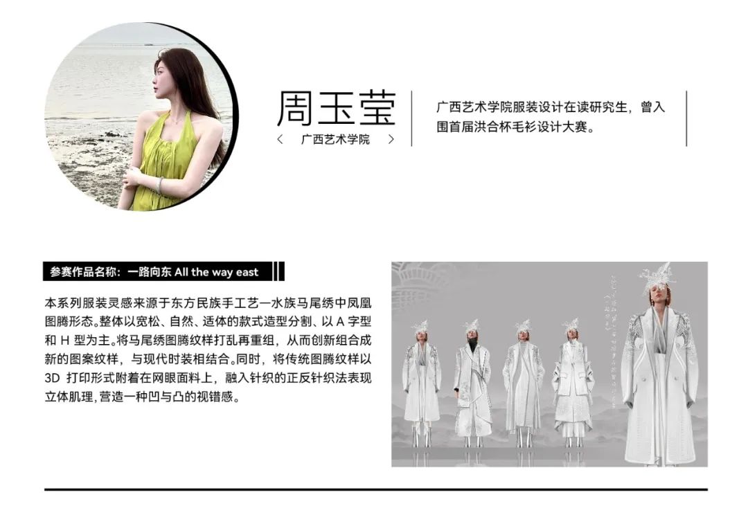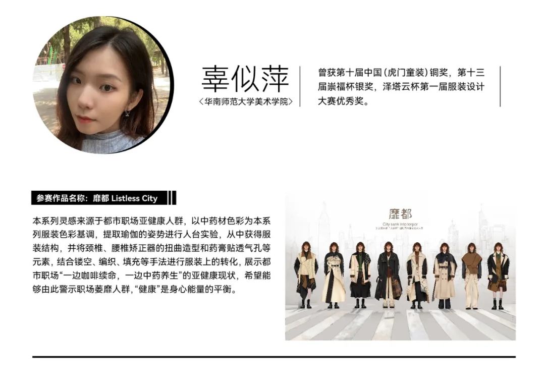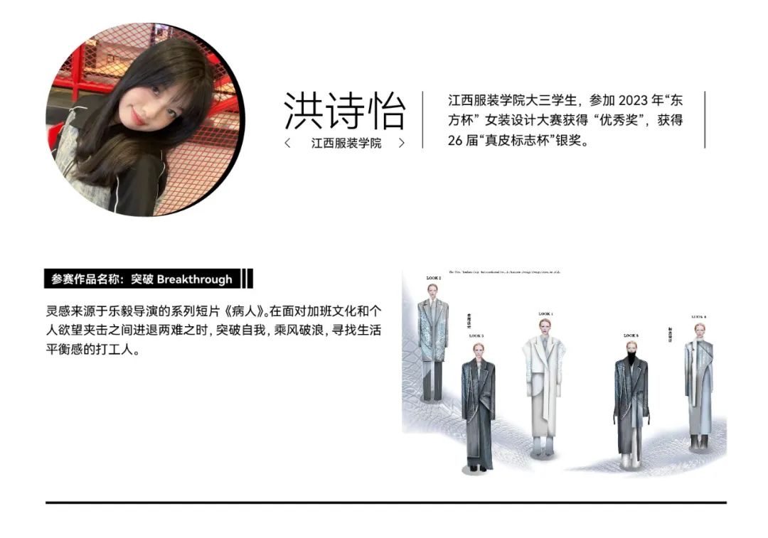 经过初选,在最终入围决赛的院校组参赛作品中,我们看到了青年设计师丰富的创作活力和实验精神。参赛作品题材新颖,极具创意,从街头潮流、传统文化到环保可持续等多个领域,都显示出当代青年设计力量对时尚的革新探索精神。